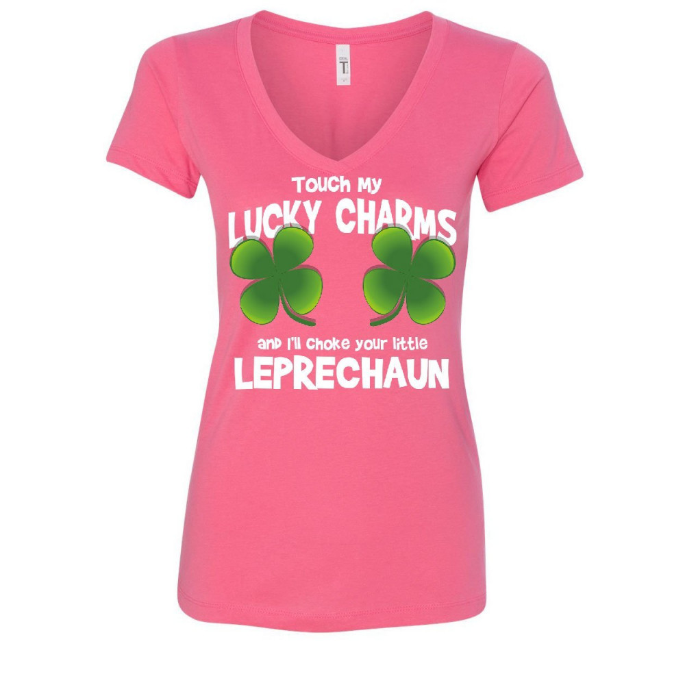 TOUCH MY LUCKY CHARMS women's v-neck t-shirt irish shamrock st. patrick's day pink