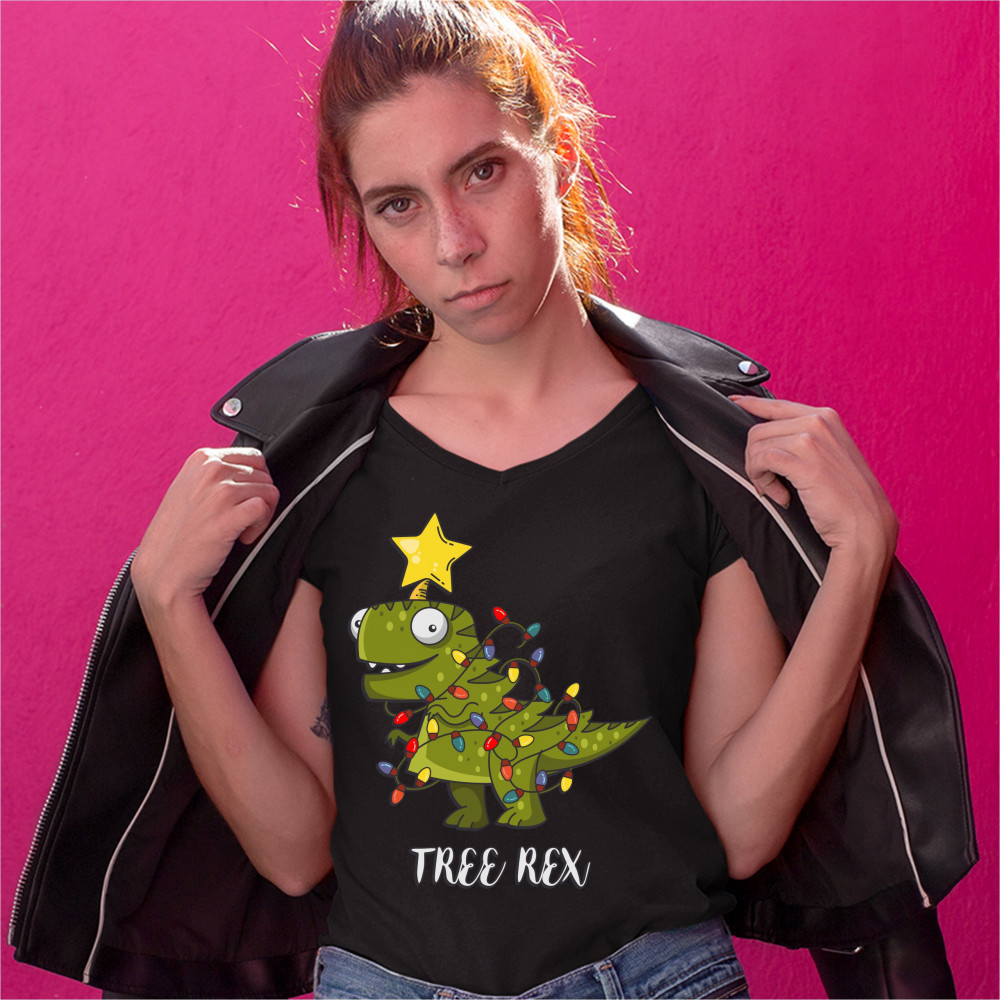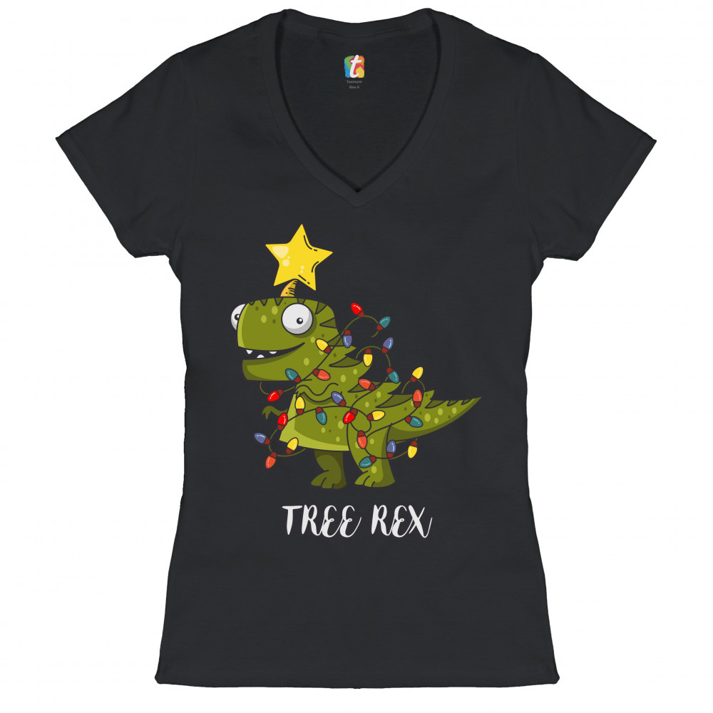 TREE REX women's v-neck t-shirt tyronnasaurus rex christmas tree dinosaur tee black