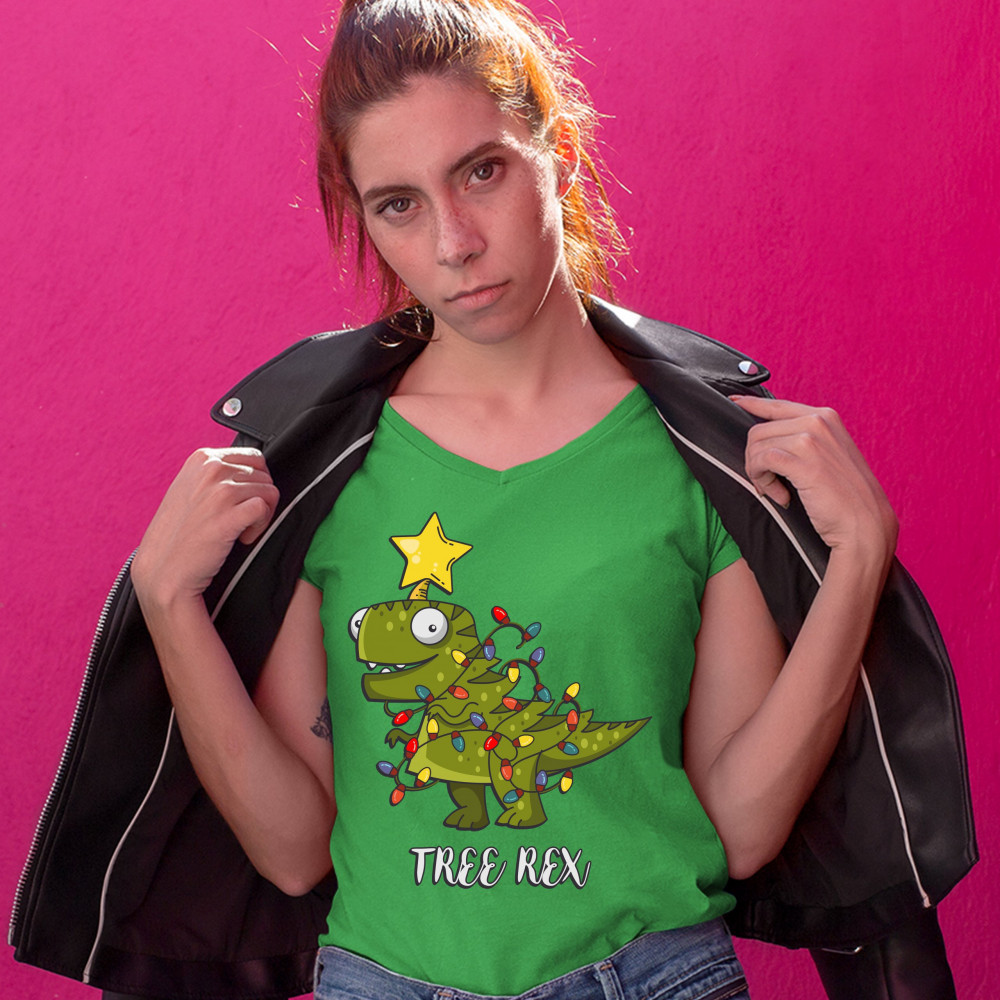 TREE REX women's v-neck t-shirt tyronnasaurus rex christmas tree dinosaur tee green
