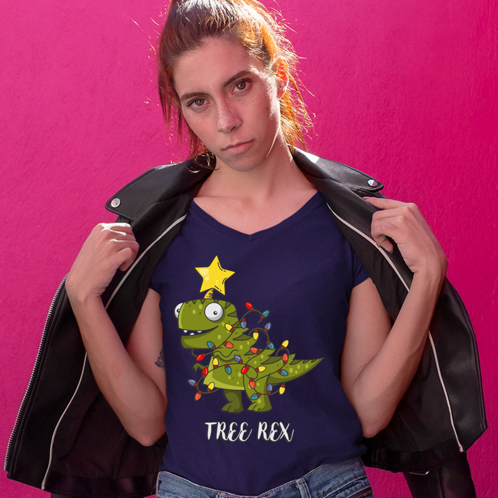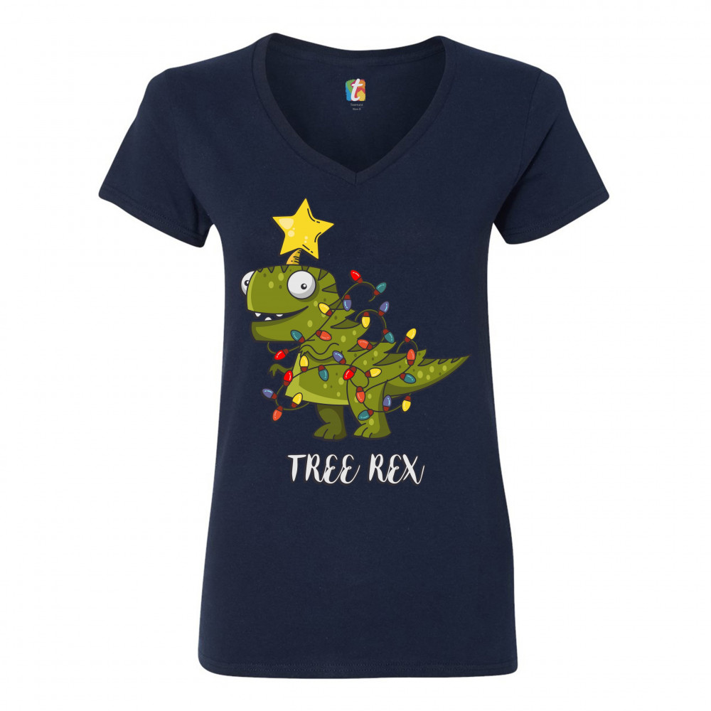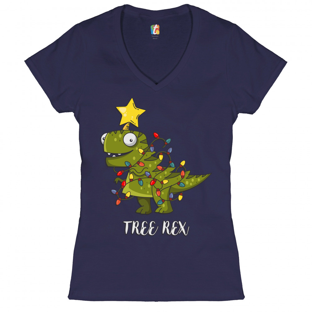 TREE REX women's v-neck t-shirt tyronnasaurus rex christmas tree dinosaur tee navy blue