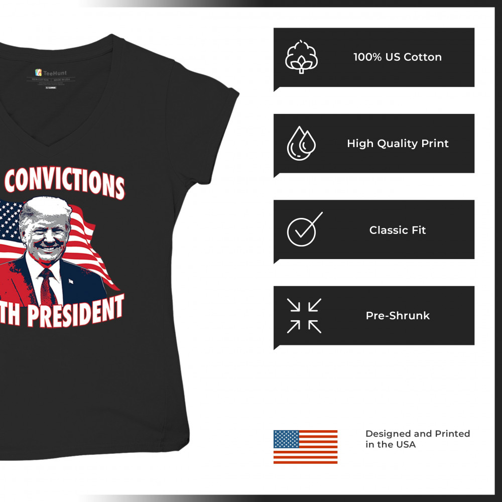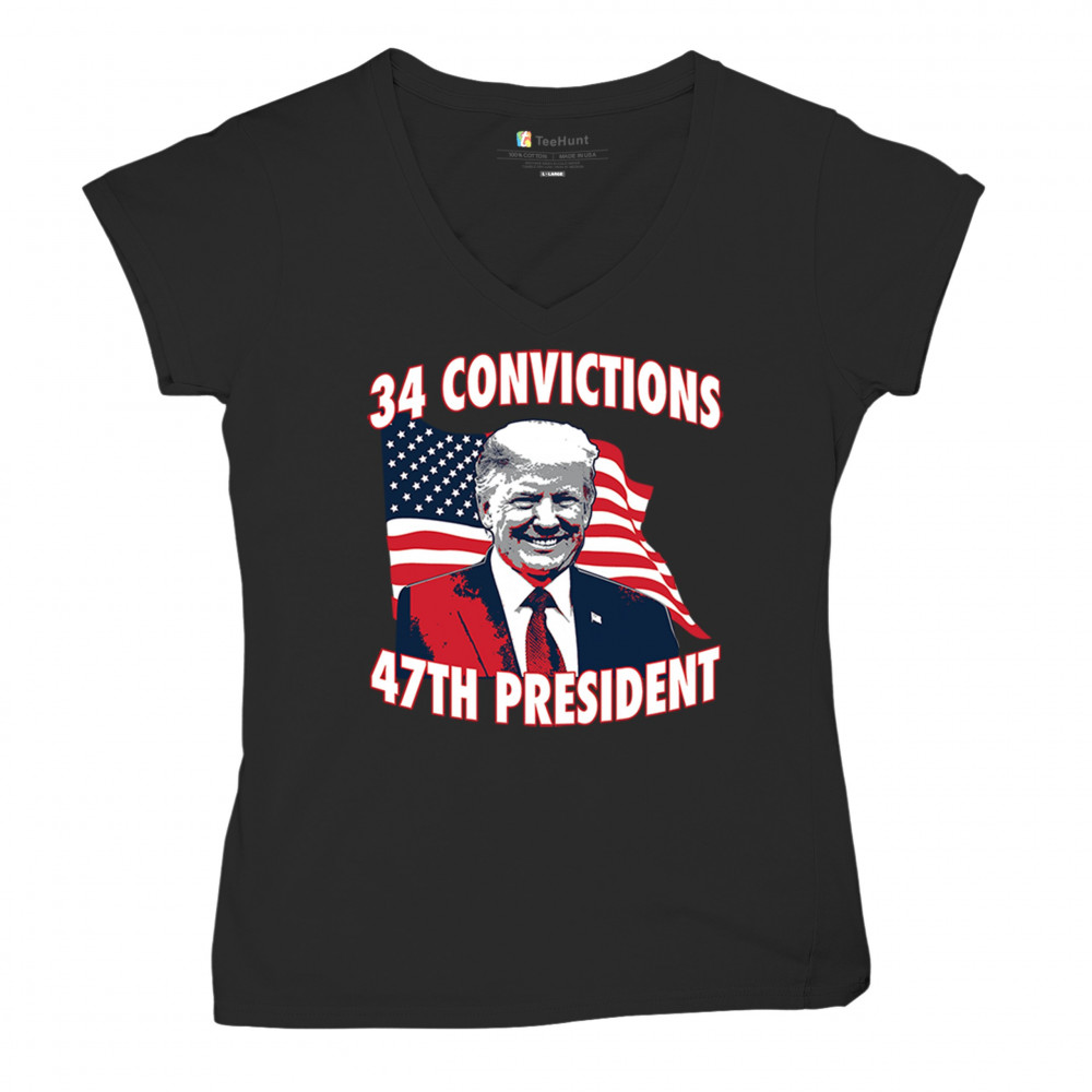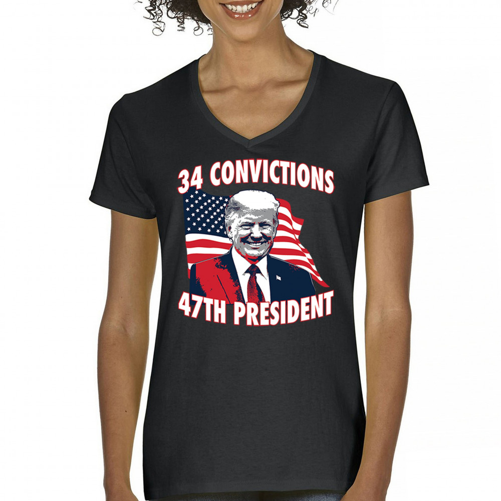 TRUMP 2024 34 CONVICTIONS 47TH PRESIDENT women's v-neck t-shirt maga usa tee black