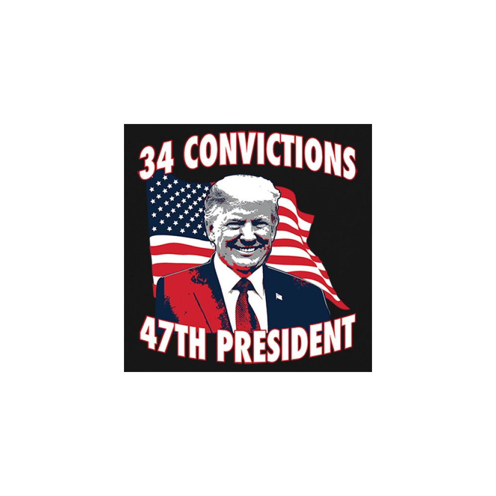 Show your support for Trump's 2024 campaign with the "34 Convictions, 47th President" design. Perfect for rallies, patriotic events, and conservative gatherings.