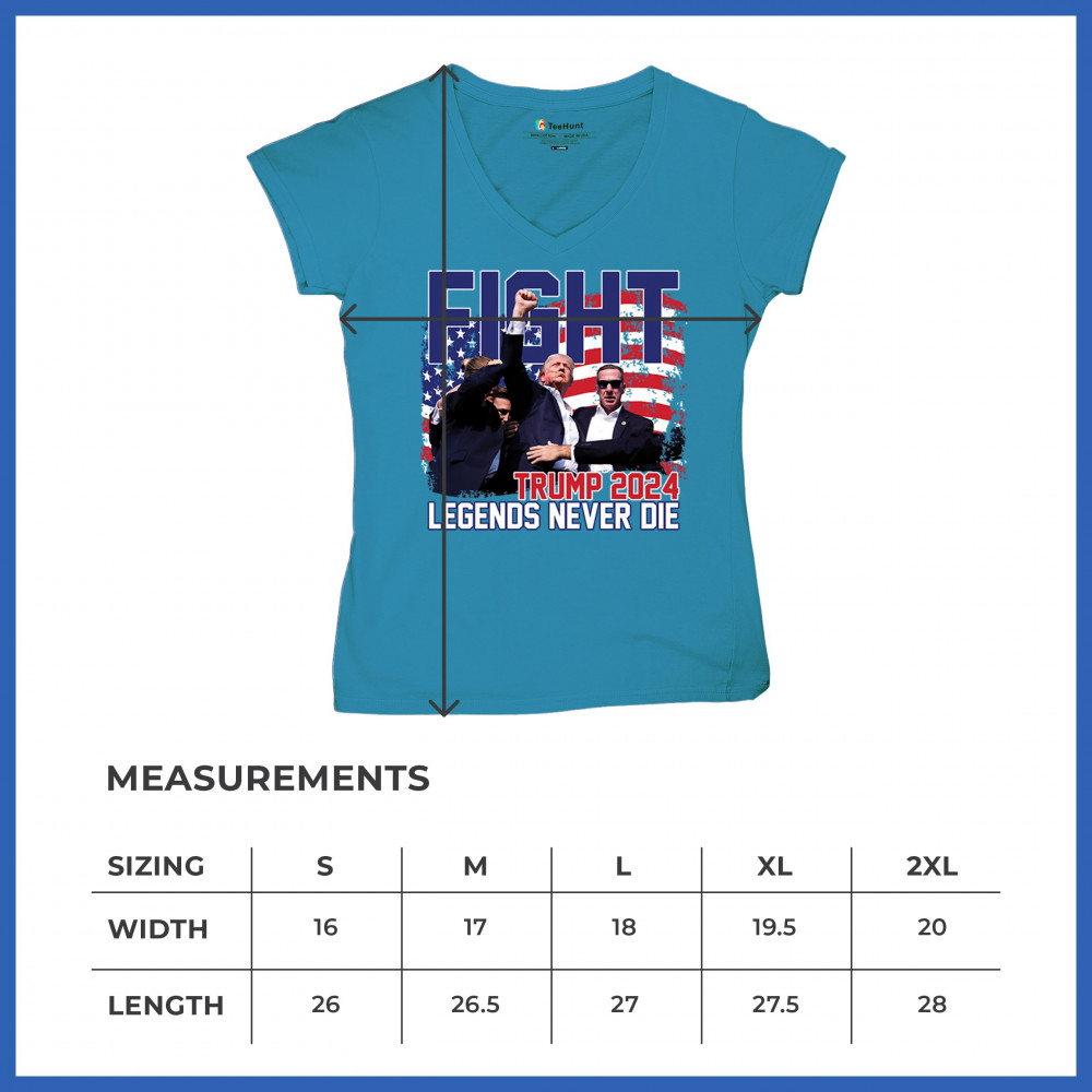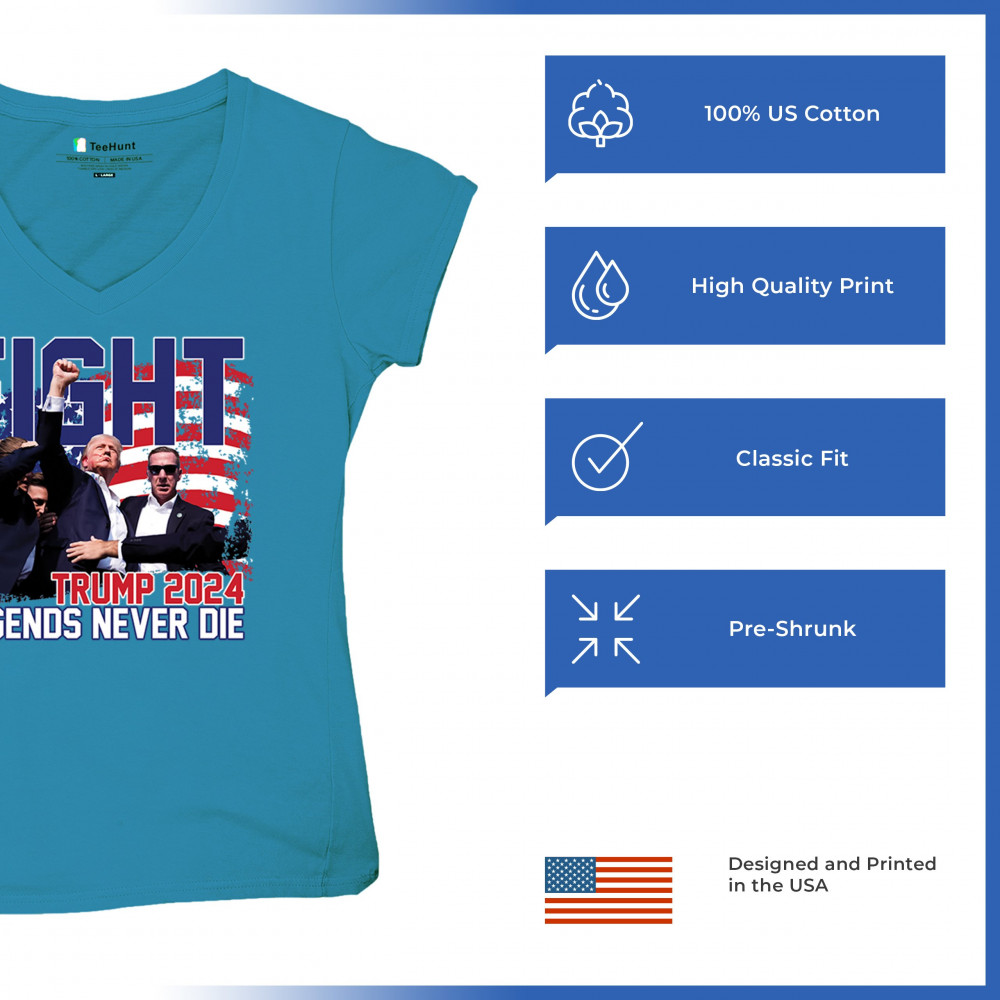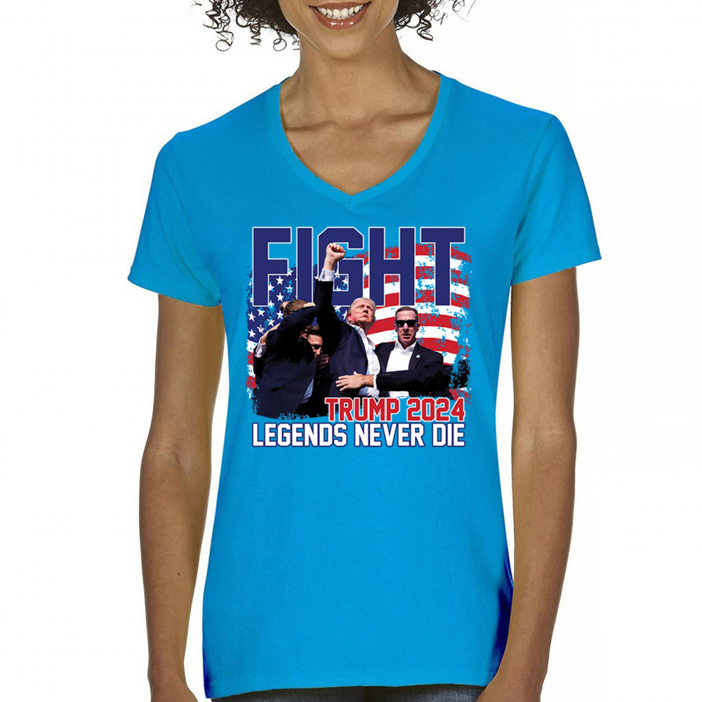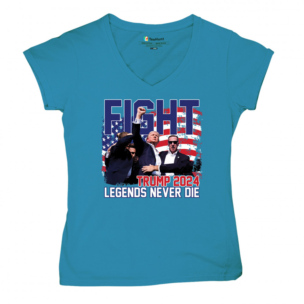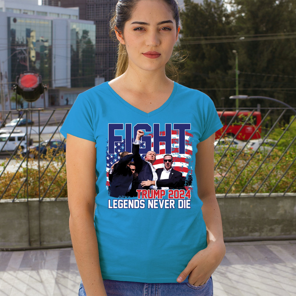 Show your Trump 2024 support with our bold "Fight" design, featuring "Legends Never Die" and a patriotic American flag. Perfect for rallies and everyday wear.