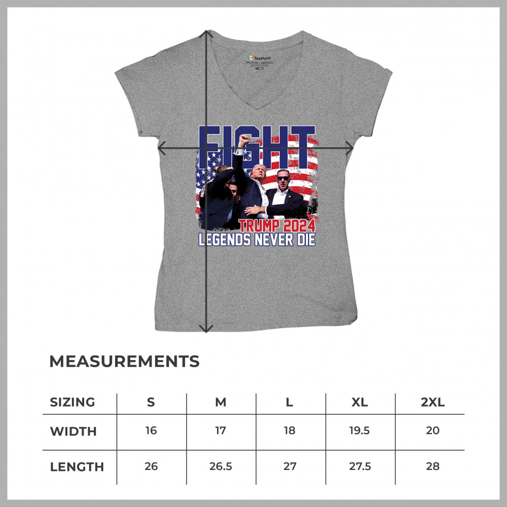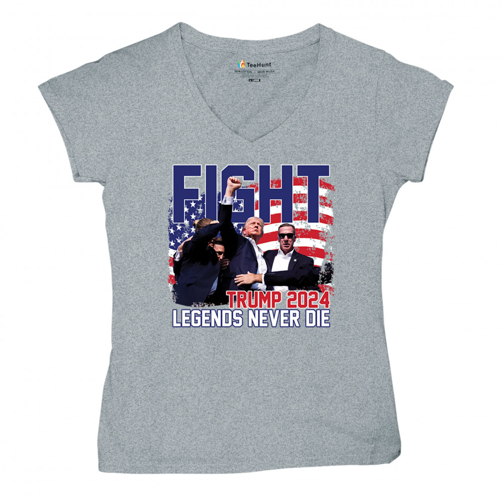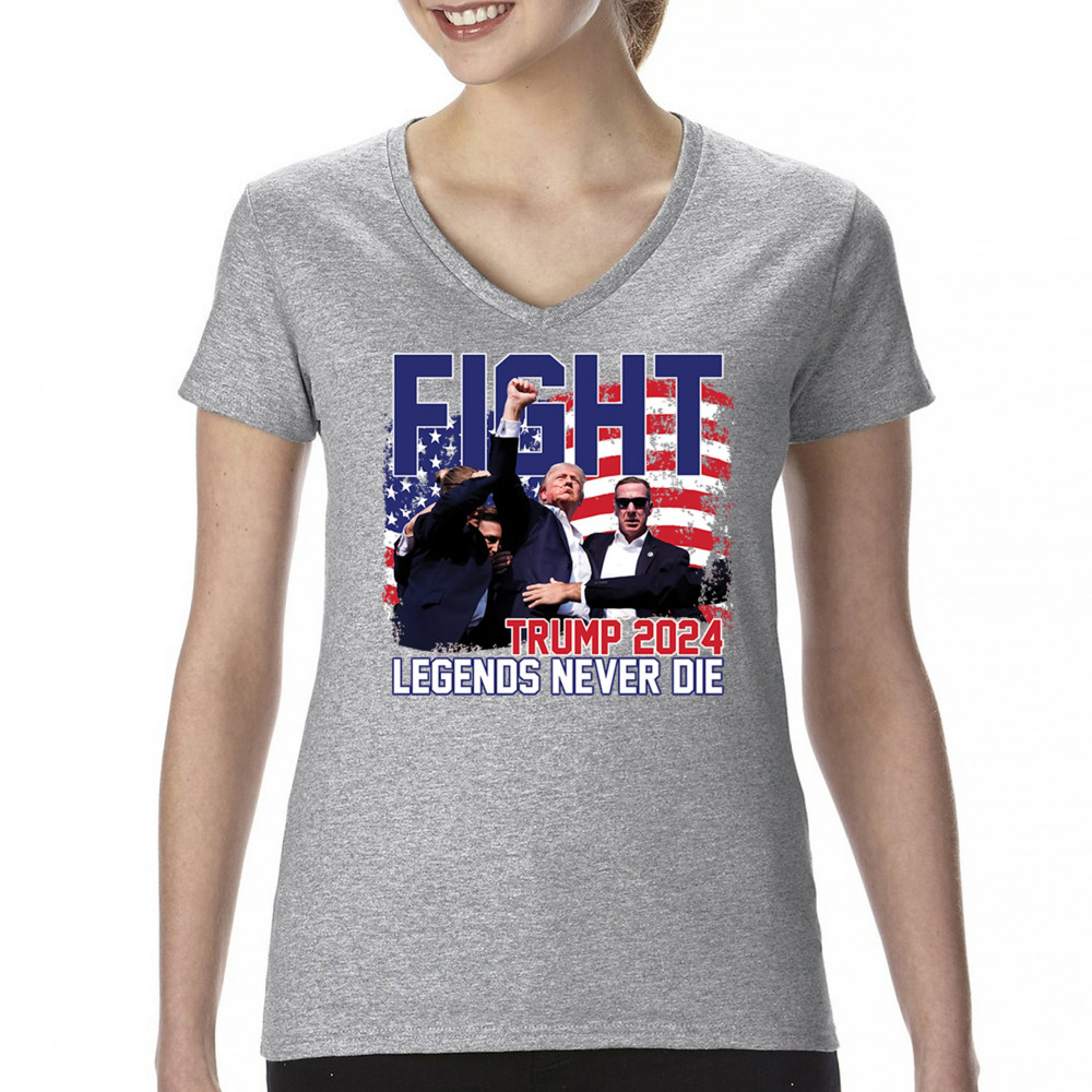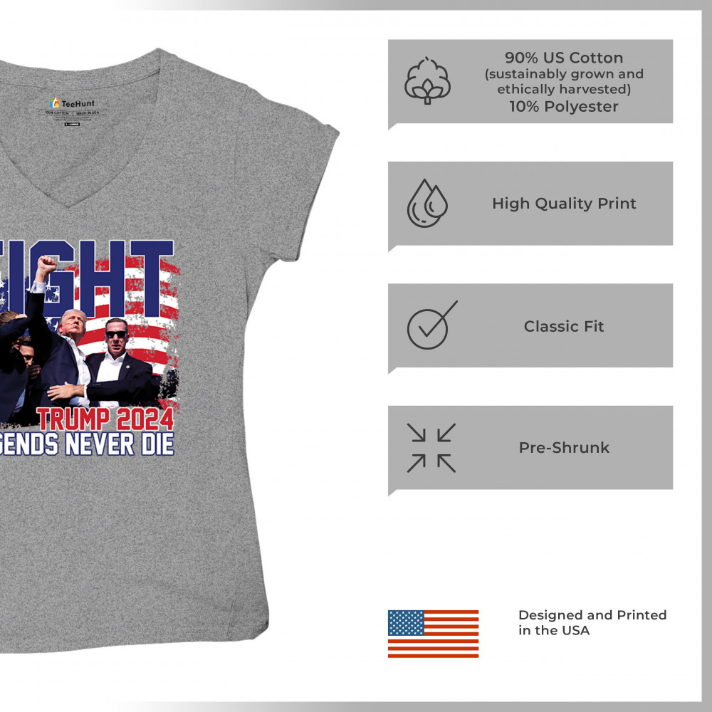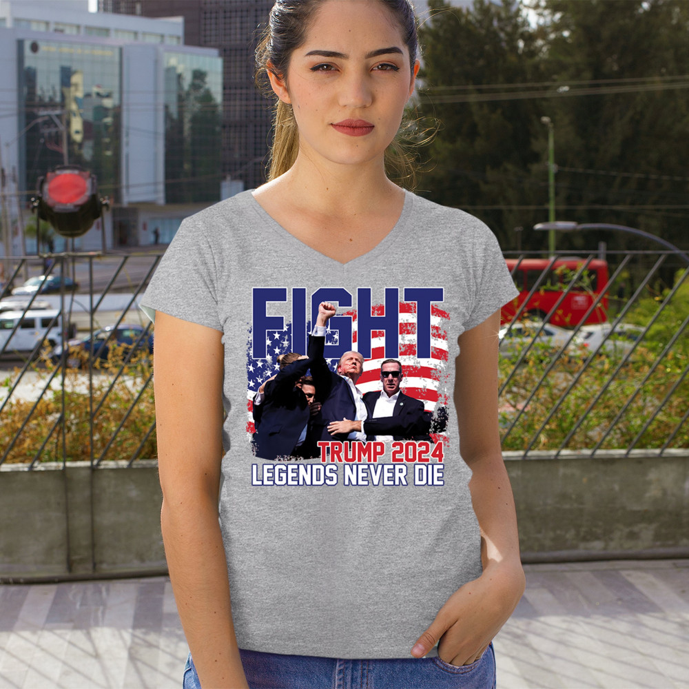 Show your Trump 2024 support with our bold "Fight" design, featuring "Legends Never Die" and a patriotic American flag. Perfect for rallies and everyday wear.