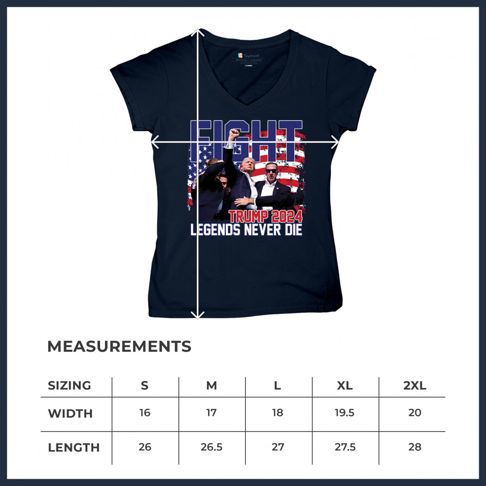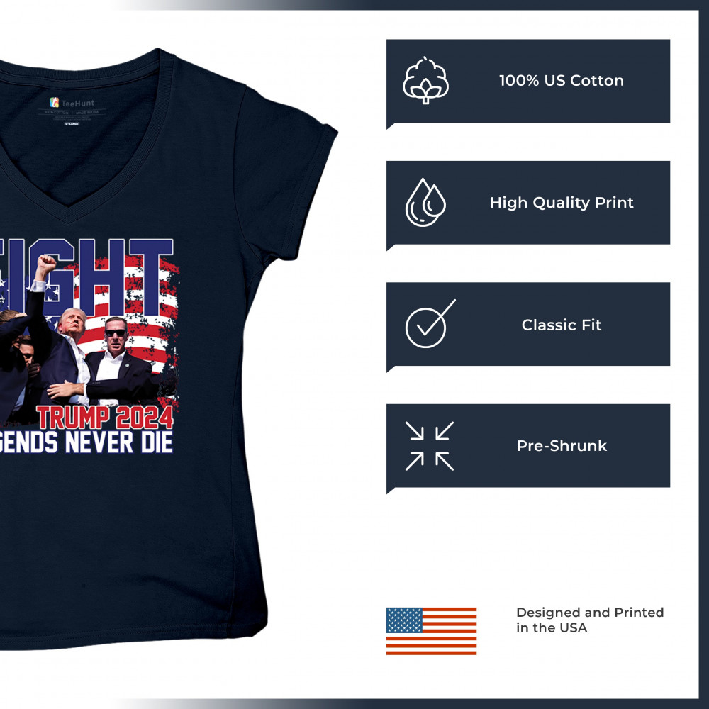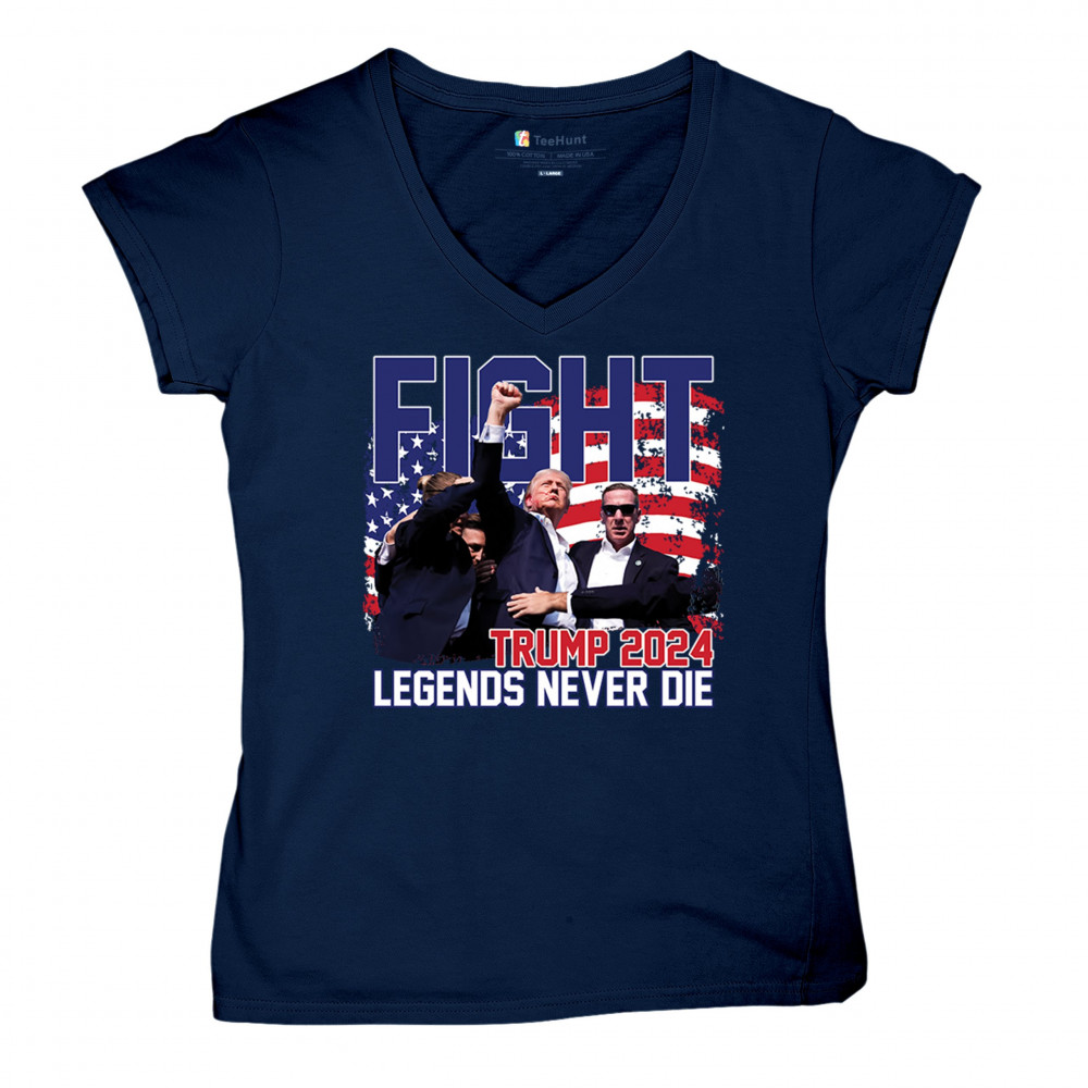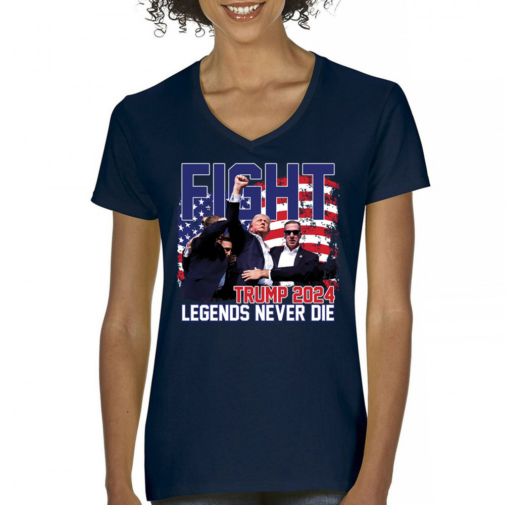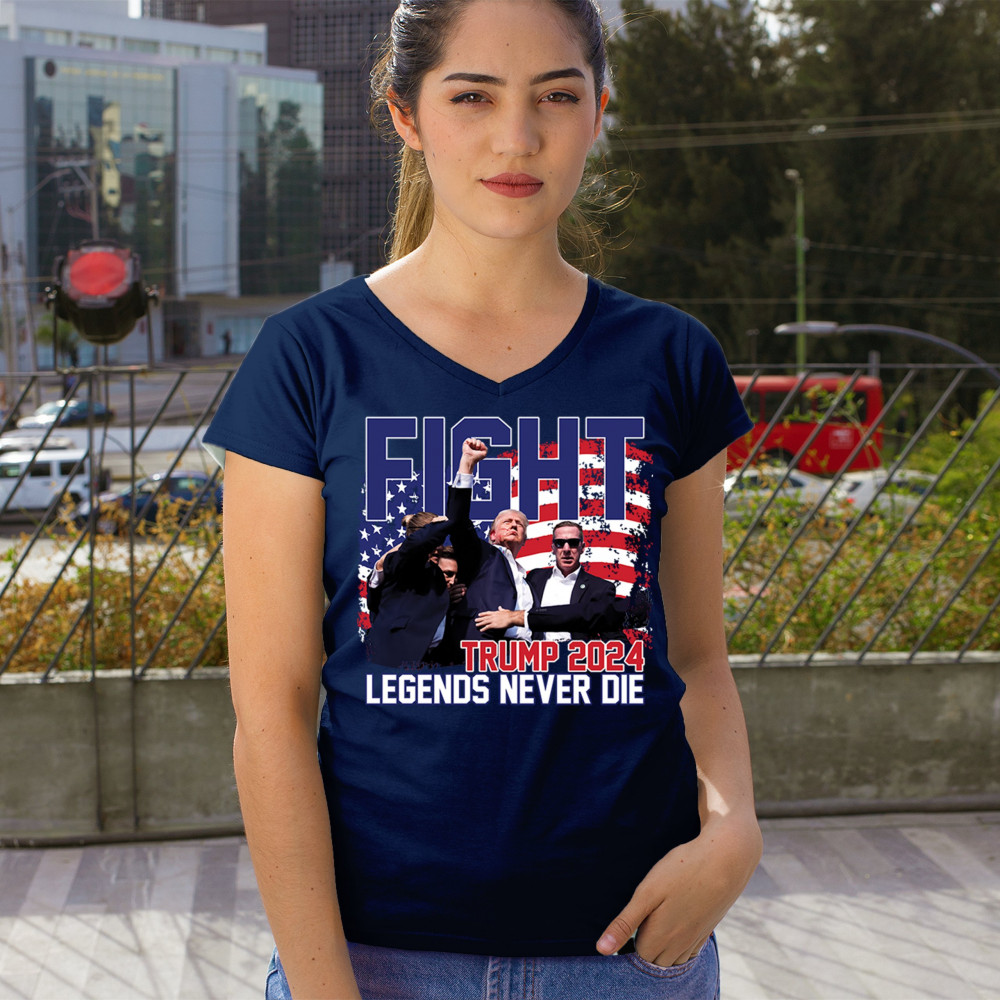 Show your Trump 2024 support with our bold "Fight" design, featuring "Legends Never Die" and a patriotic American flag. Perfect for rallies and everyday wear.