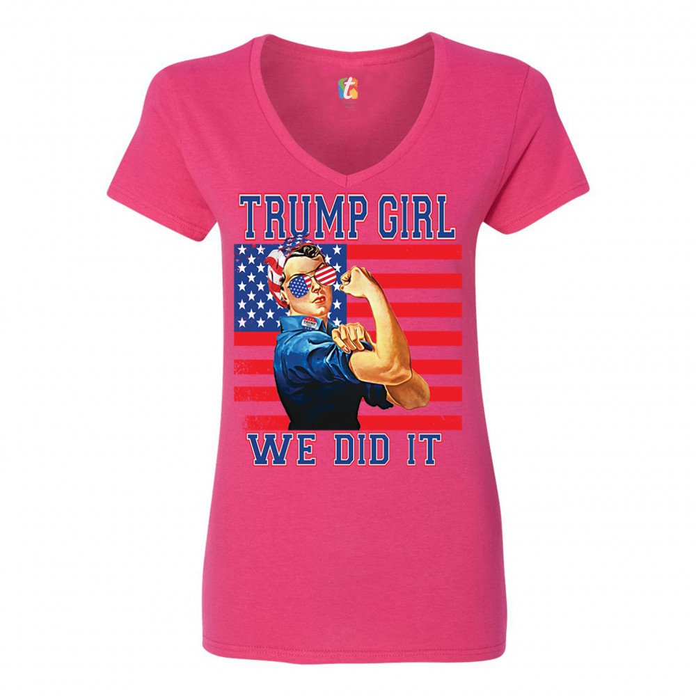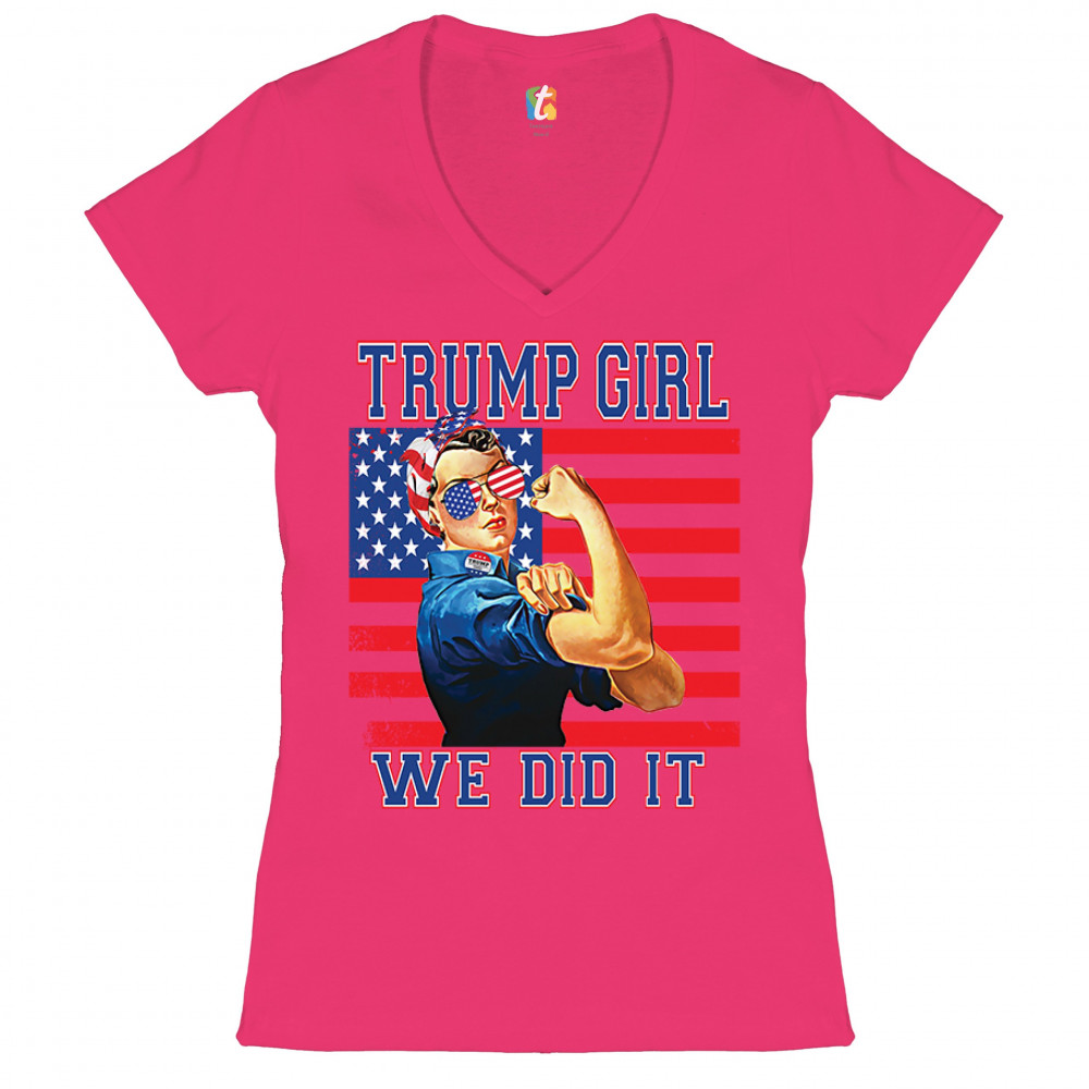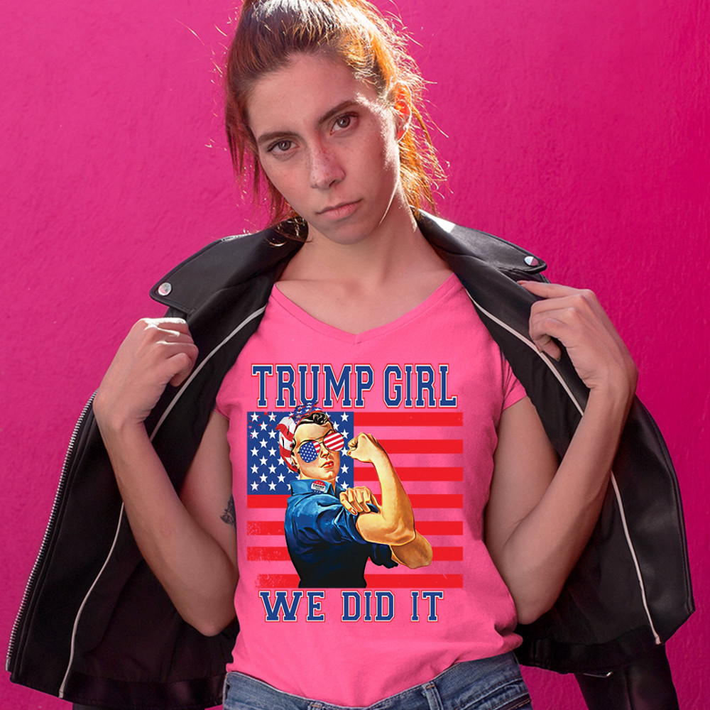 A political print saying "Trump girl, we did it". The print features the WWII icon Rosie the Riveter wearing American flag bandana and glasses. She also wears a "Trump 2020" badge. In the background there is the American Flag. A great choice to wear for a