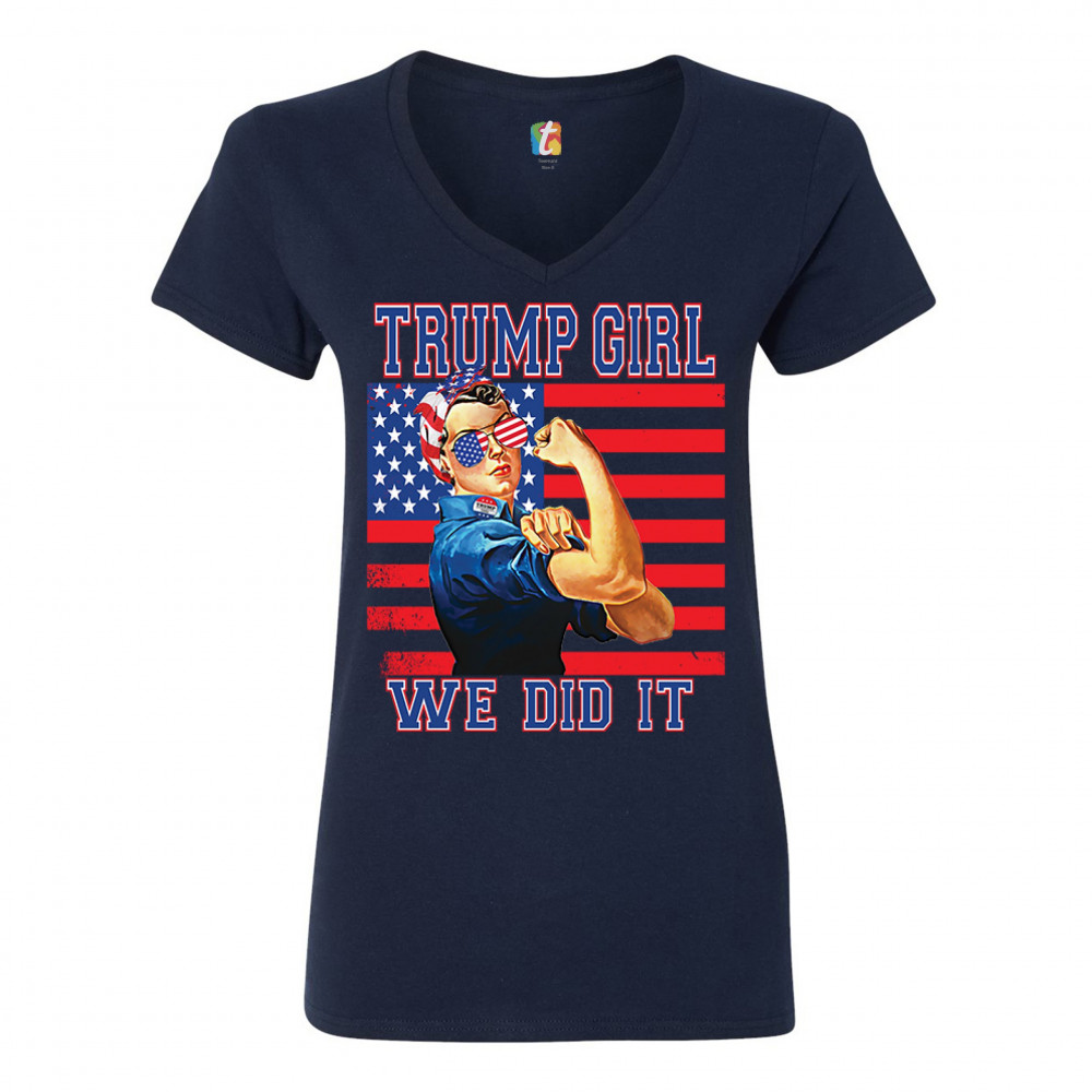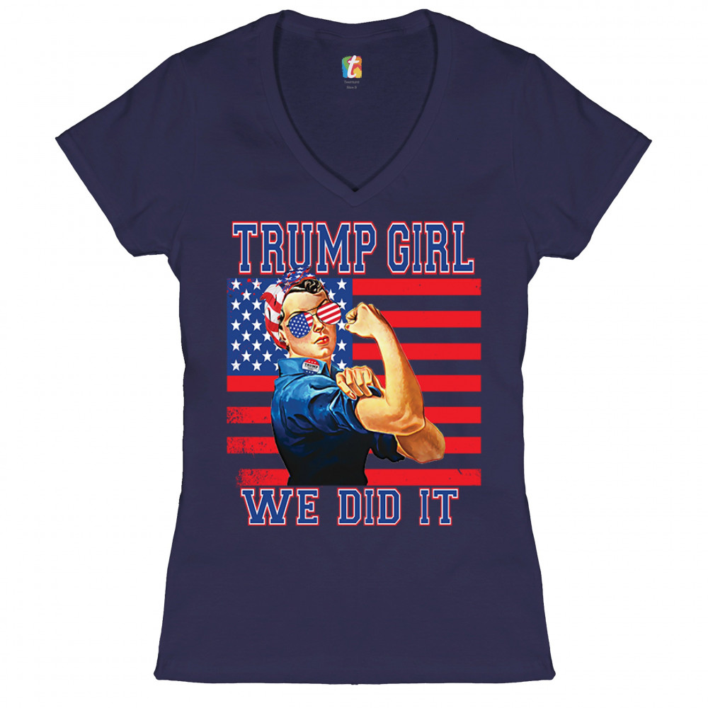TRUMP GIRL WE DID IT women's v-neck t-shirt pro trump 2020 american flag tee navy blue