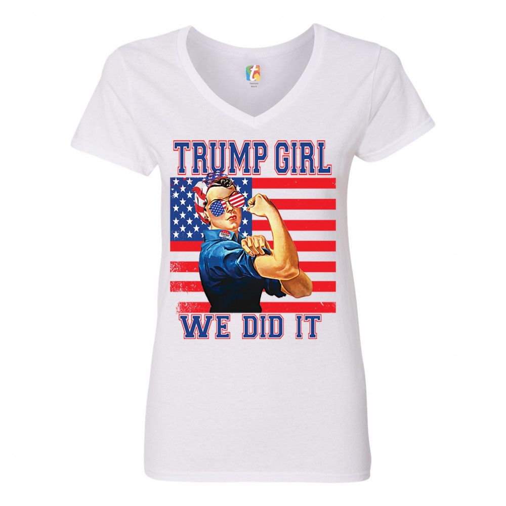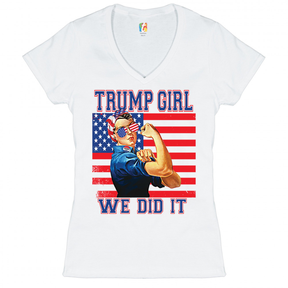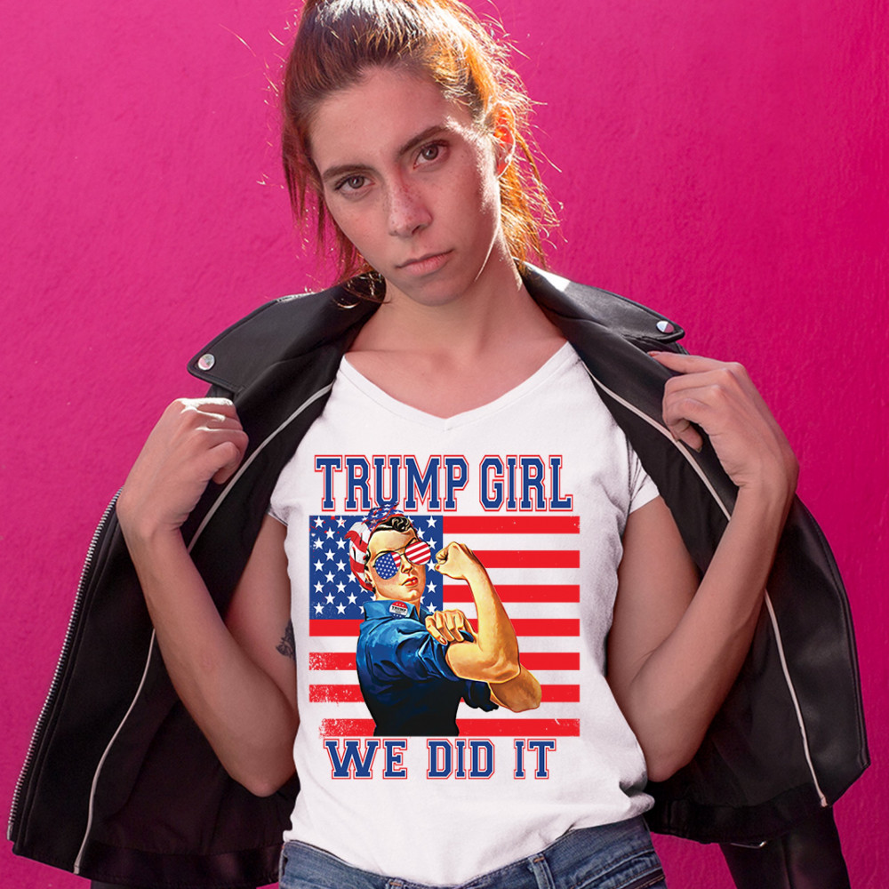 A political print saying "Trump girl, we did it". The print features the WWII icon Rosie the Riveter wearing American flag bandana and glasses. She also wears a "Trump 2020" badge. In the background there is the American Flag. A great choice to wear for a