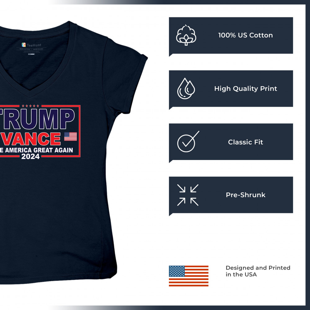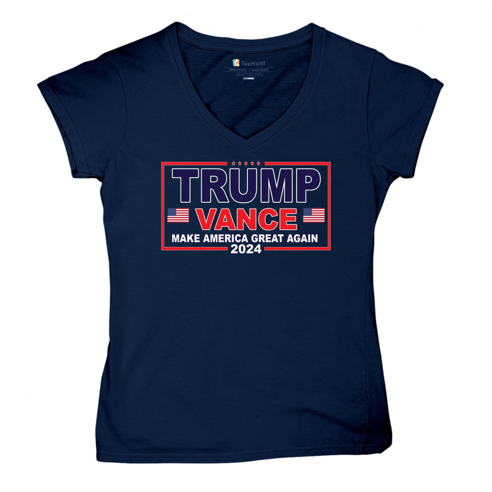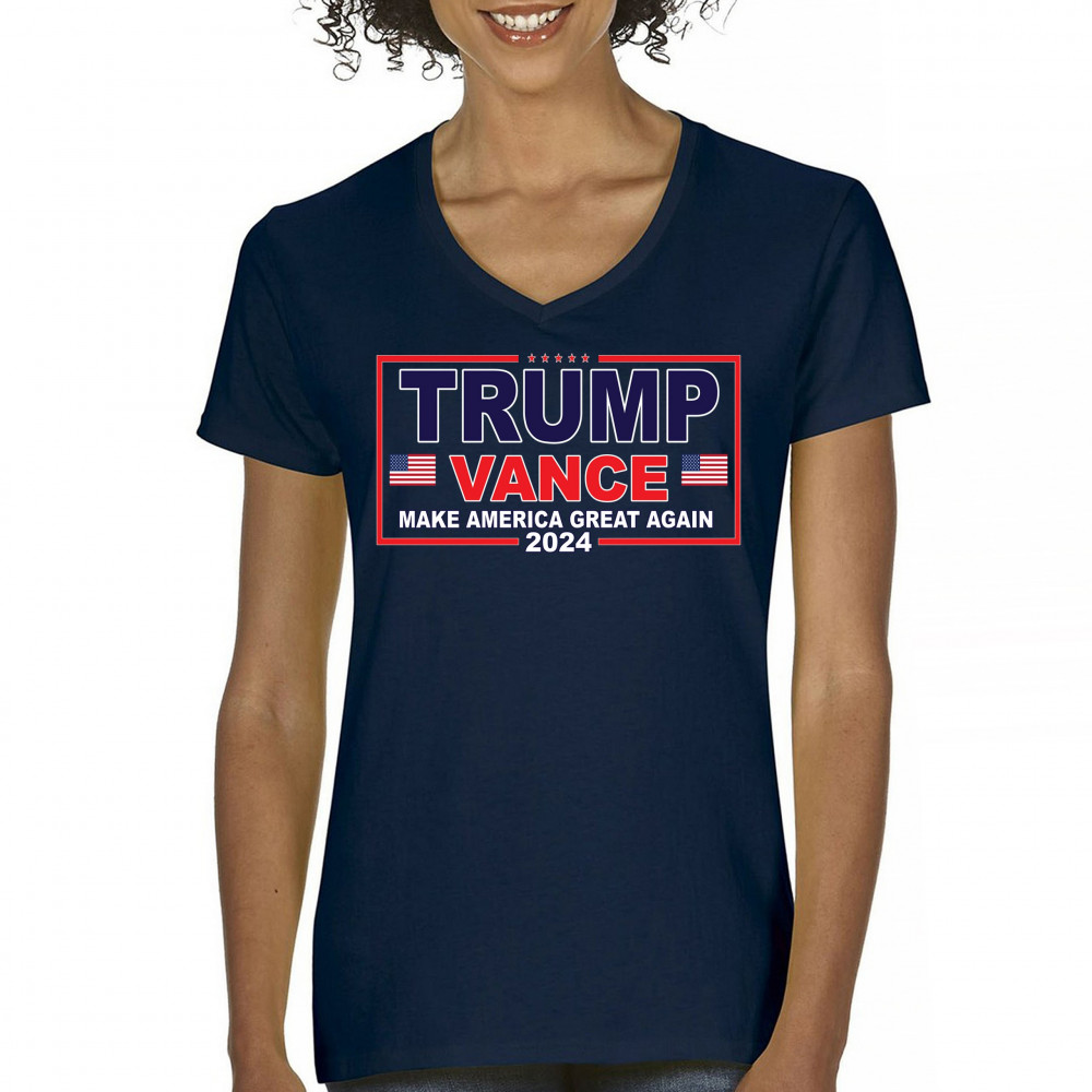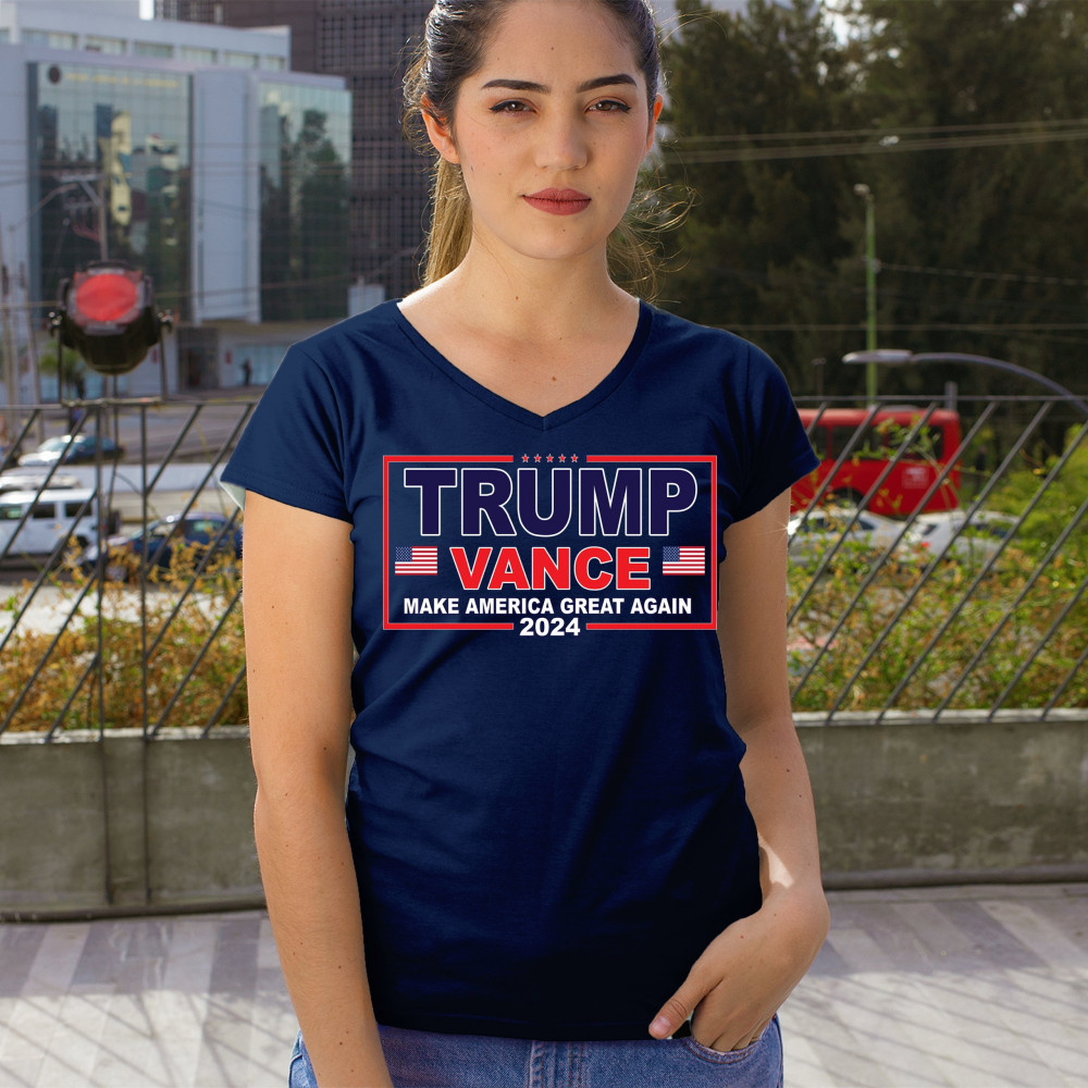 Showcase your support for the Trump-Vance 2024 campaign with this bold patriotic design featuring the American flag and "Make America Great Again" slogan.