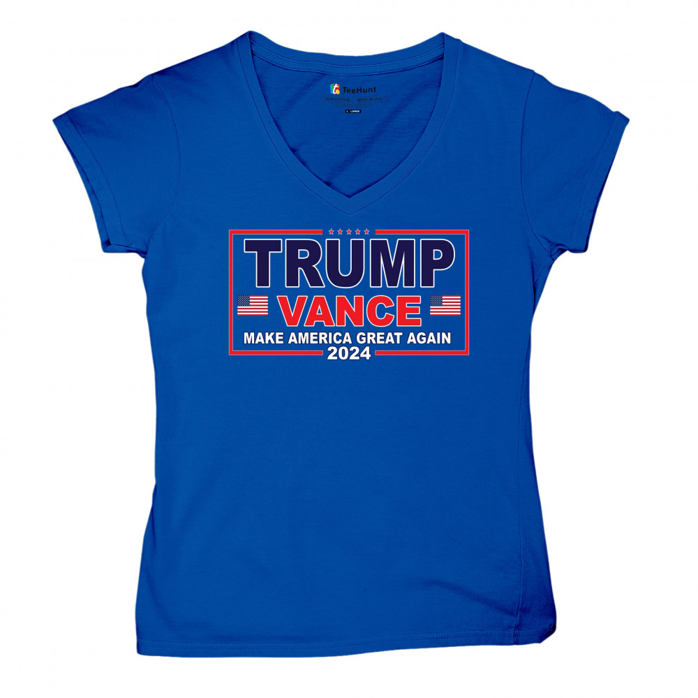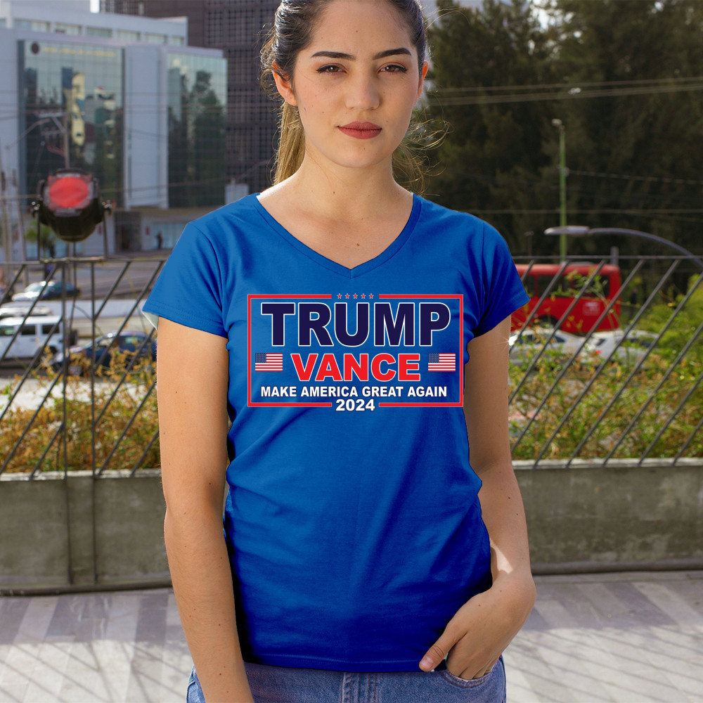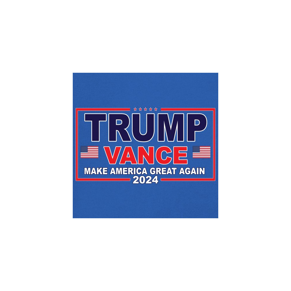 Showcase your support for the Trump-Vance 2024 campaign with this bold patriotic design featuring the American flag and "Make America Great Again" slogan.