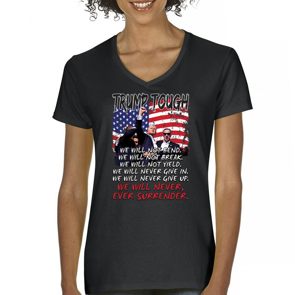 Display your unwavering support for Donald Trump with this powerful design. Crafted for those who believe in conservative values and the America First agenda, it’s perfect for any rally or event. With a striking image and the American flag in the background, this design embodies the spirit of those who refuse to give up or surrender. Show your dedication and pride every time you wear this. Join the movement and stand firm in your beliefs.