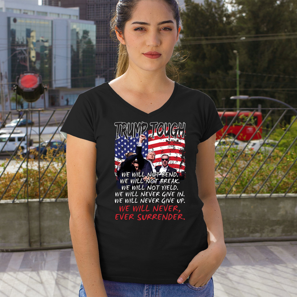 Express your support for Trump 2024 with this bold, patriotic design featuring the American flag and a powerful message. Never surrender your values.