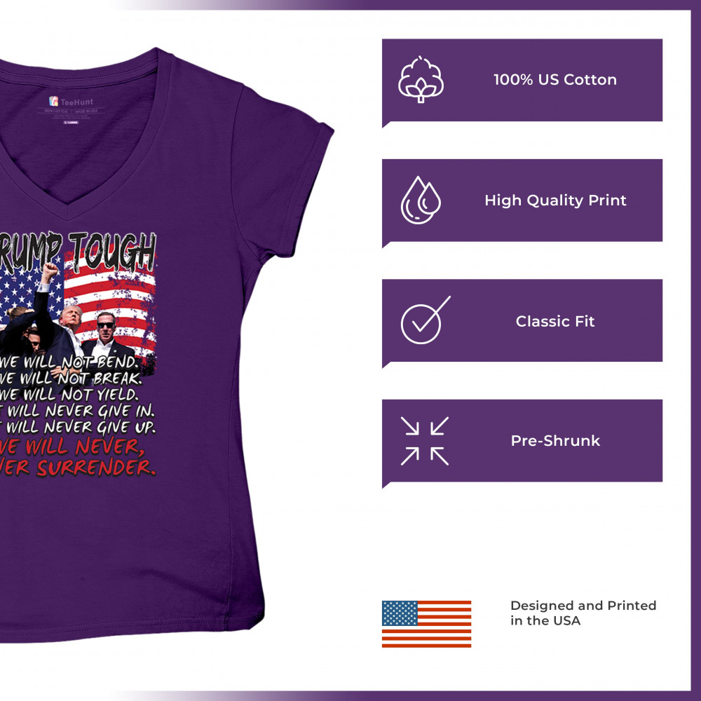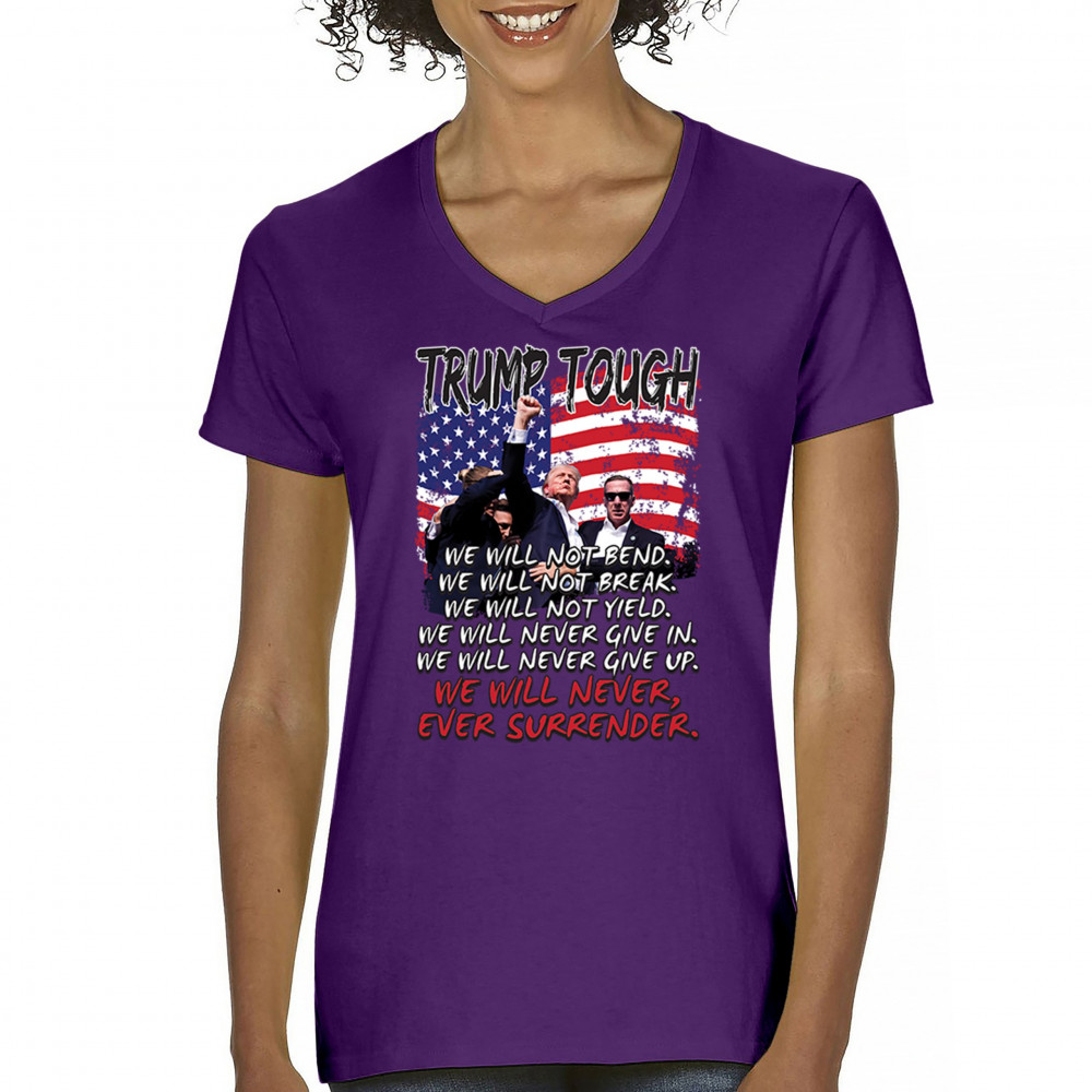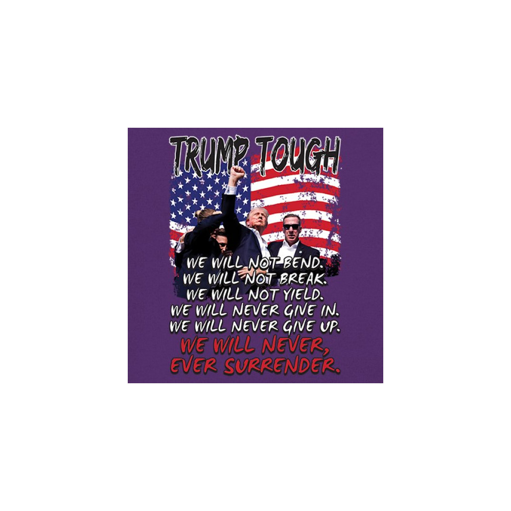 Display your unwavering support for Donald Trump with this powerful design. Crafted for those who believe in conservative values and the America First agenda, it’s perfect for any rally or event. With a striking image and the American flag in the background, this design embodies the spirit of those who refuse to give up or surrender. Show your dedication and pride every time you wear this. Join the movement and stand firm in your beliefs.