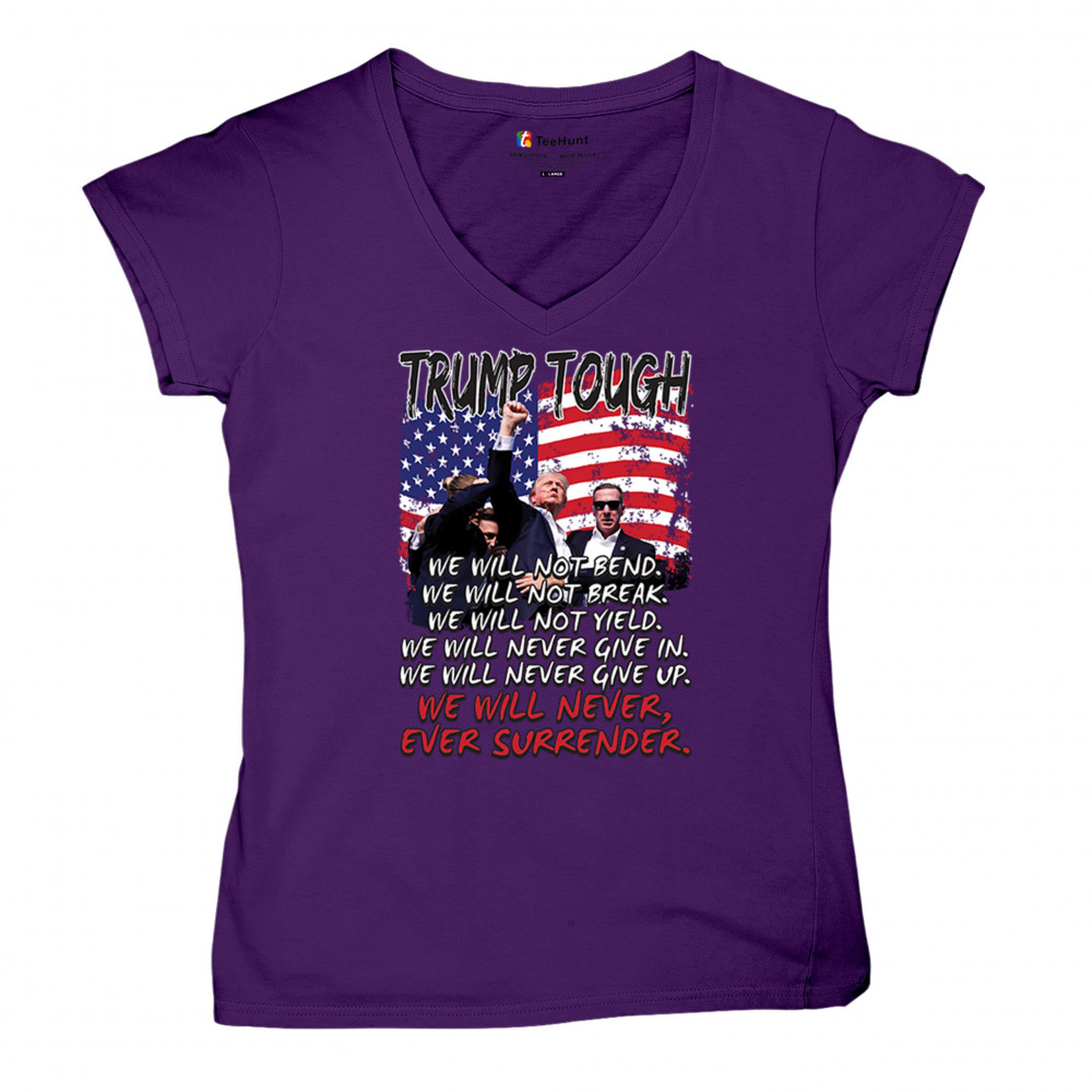 Express your support for Trump 2024 with this bold, patriotic design featuring the American flag and a powerful message. Never surrender your values.