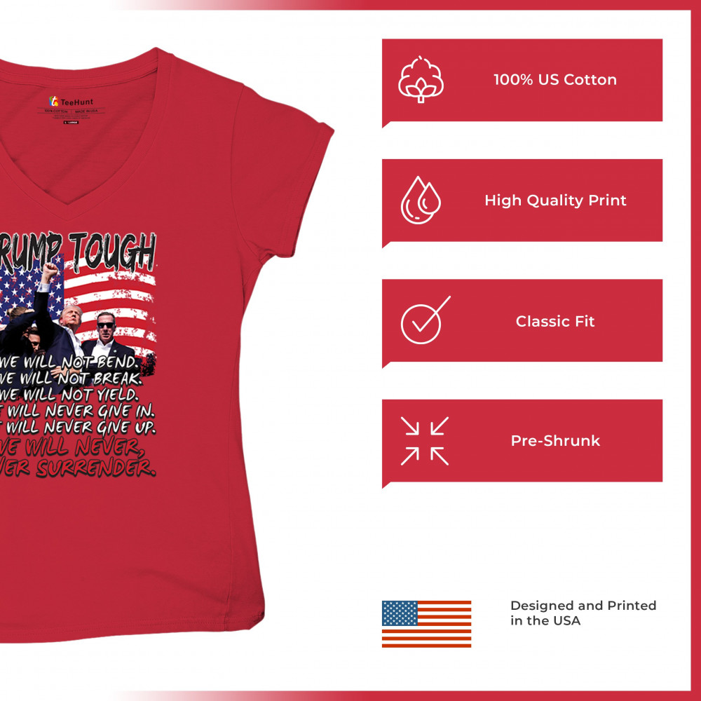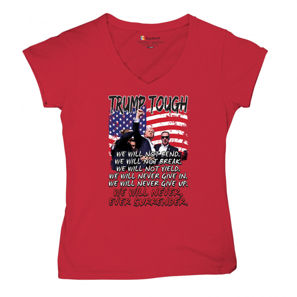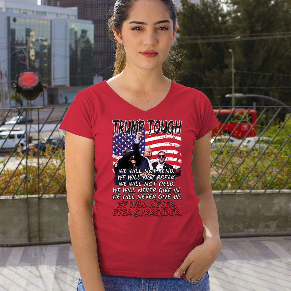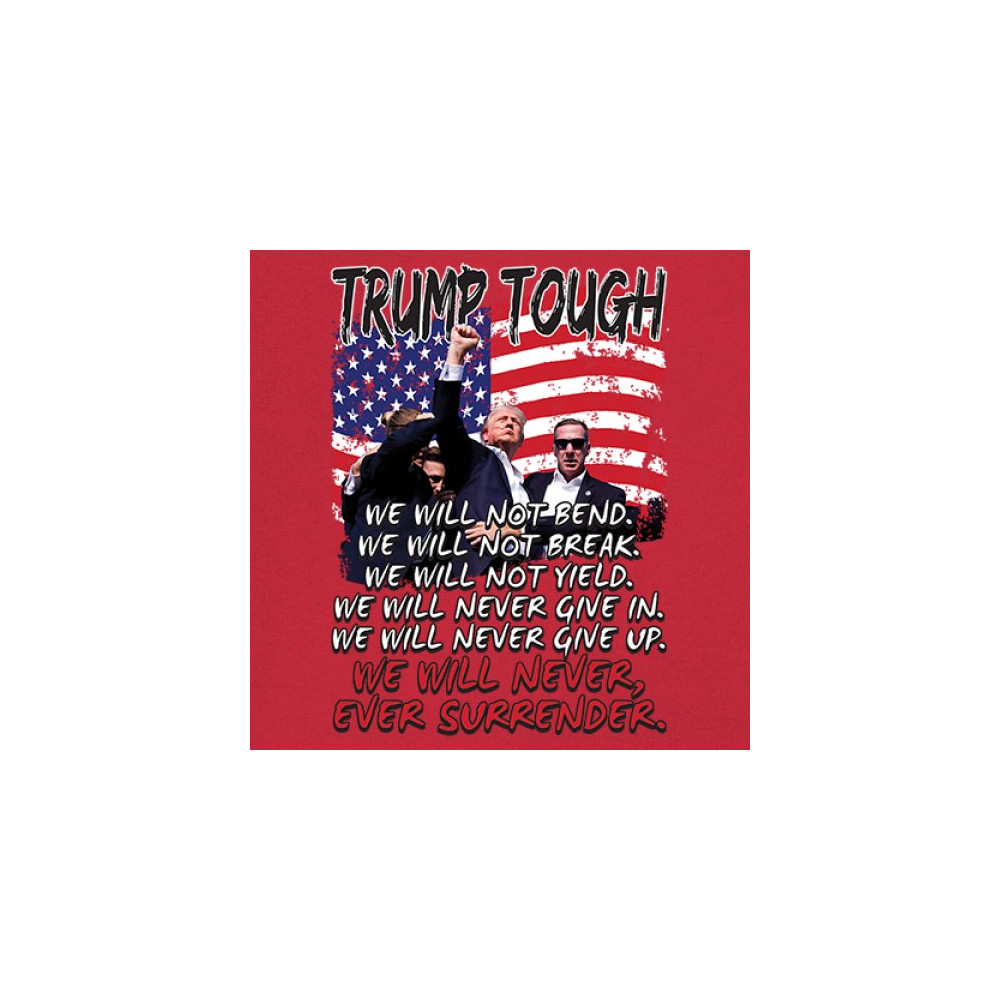 Express your support for Trump 2024 with this bold, patriotic design featuring the American flag and a powerful message. Never surrender your values.