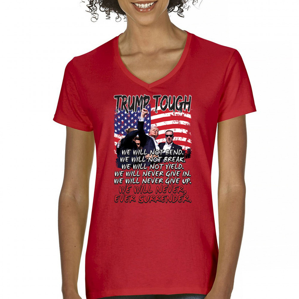 Display your unwavering support for Donald Trump with this powerful design. Crafted for those who believe in conservative values and the America First agenda, it’s perfect for any rally or event. With a striking image and the American flag in the background, this design embodies the spirit of those who refuse to give up or surrender. Show your dedication and pride every time you wear this. Join the movement and stand firm in your beliefs.