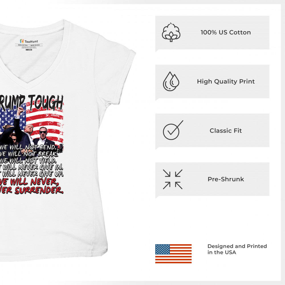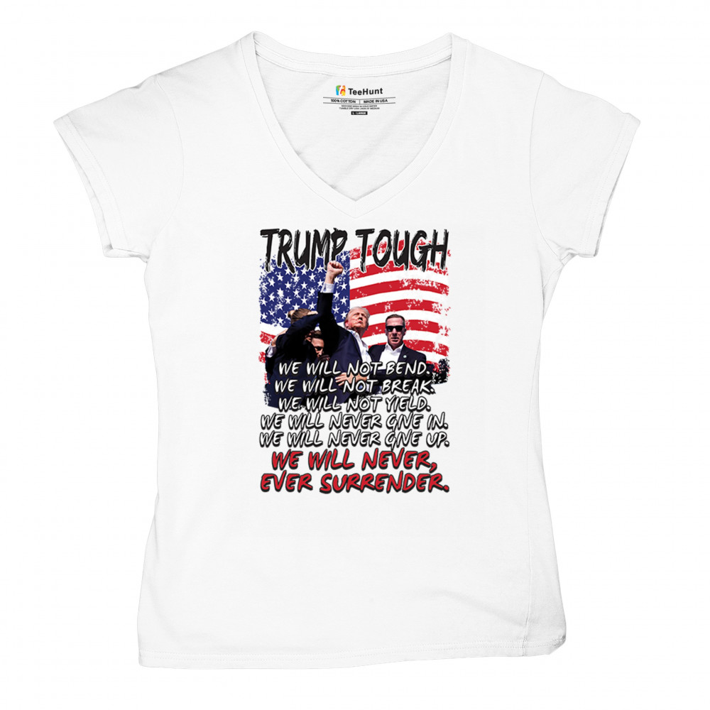 Express your support for Trump 2024 with this bold, patriotic design featuring the American flag and a powerful message. Never surrender your values.
