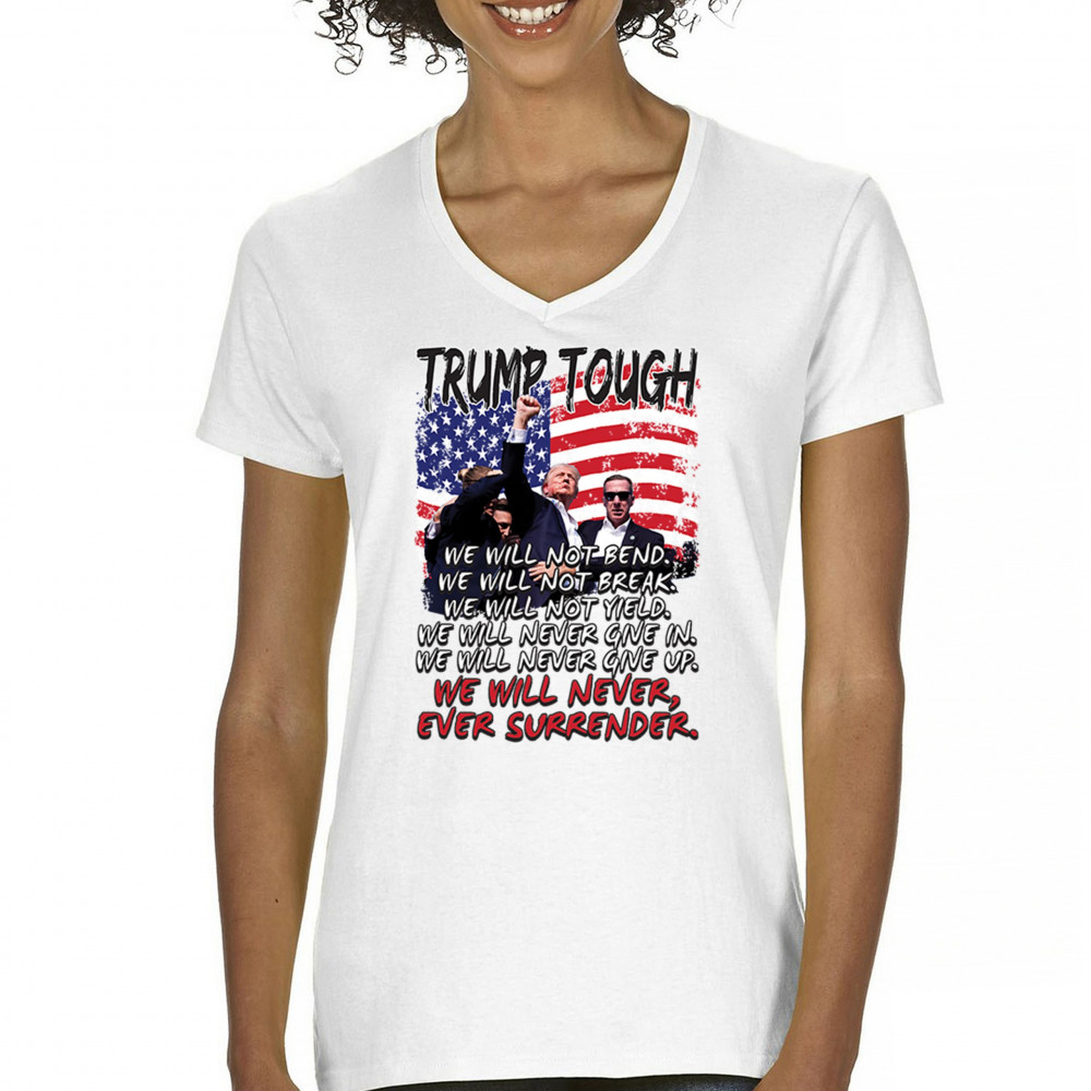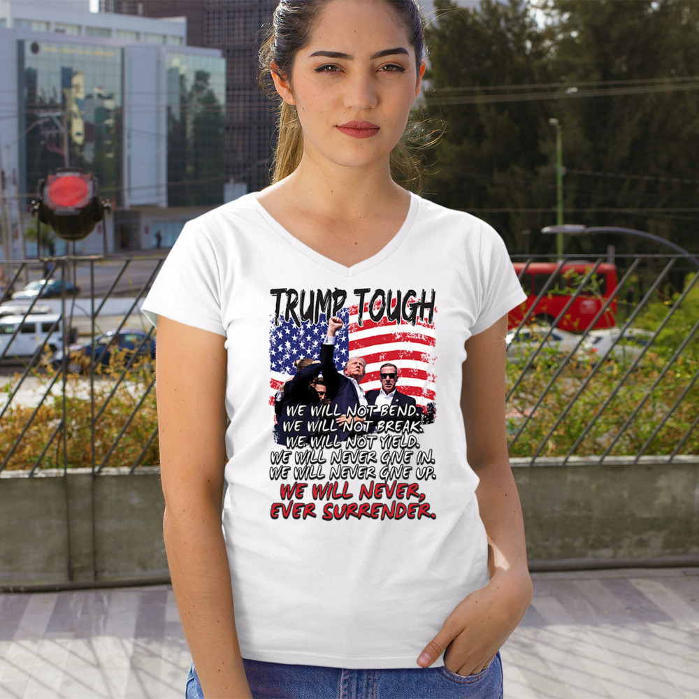Display your unwavering support for Donald Trump with this powerful design. Crafted for those who believe in conservative values and the America First agenda, it’s perfect for any rally or event. With a striking image and the American flag in the background, this design embodies the spirit of those who refuse to give up or surrender. Show your dedication and pride every time you wear this. Join the movement and stand firm in your beliefs.