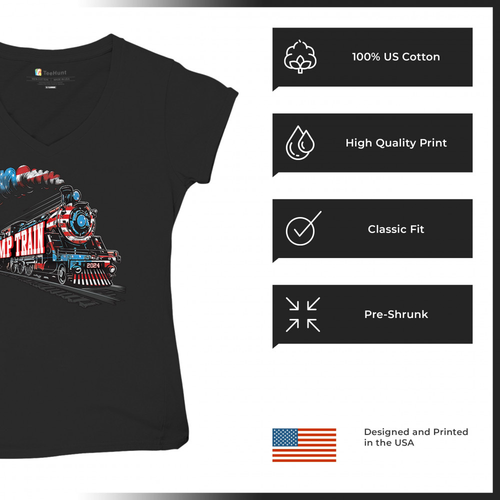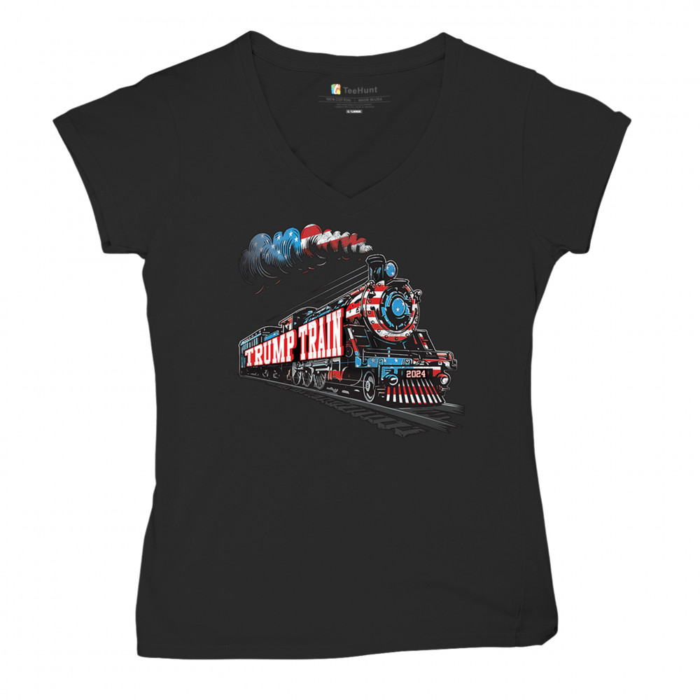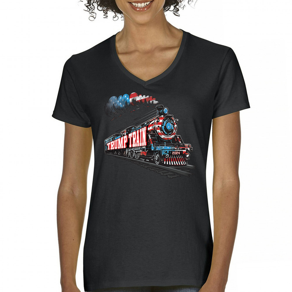 TRUMP TRAIN 2024 women's v-neck t-shirt vance musk rfk america first maga tee black