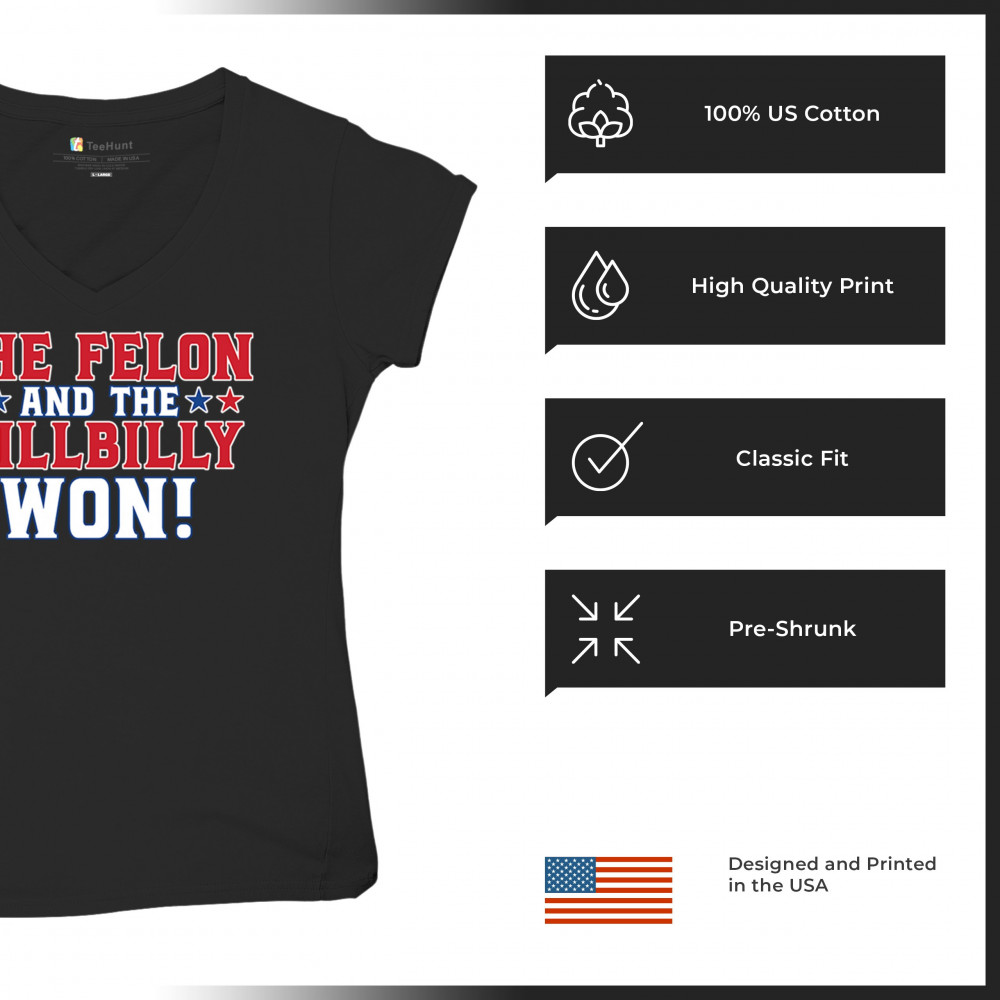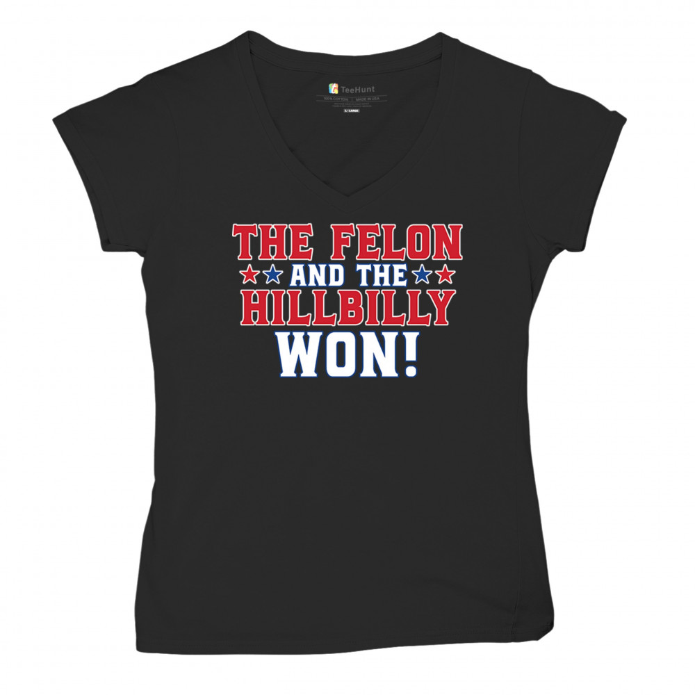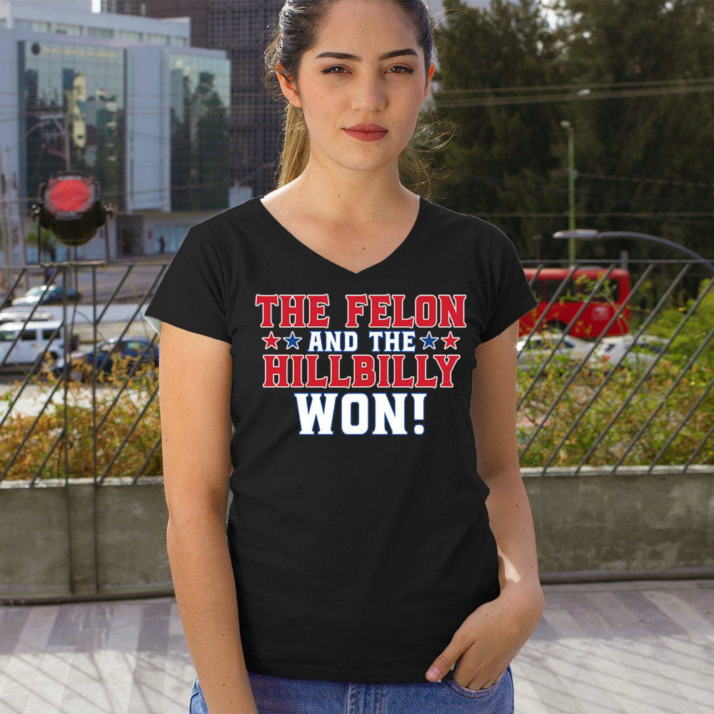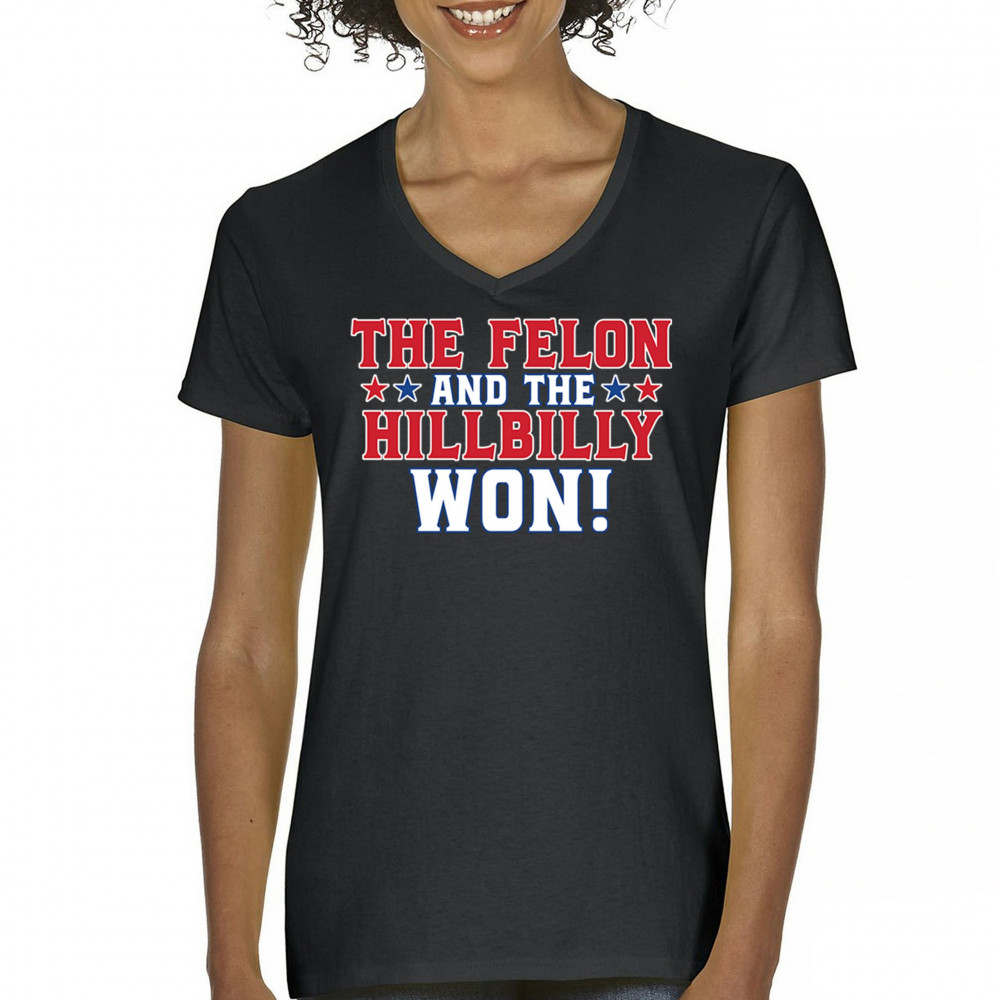 TRUMP VANCE 2024 THE FELON AND THE HILLBILLY WON trump vance 24 the felon and the hillbilly won women's v-neck t-shirt maga tee black
