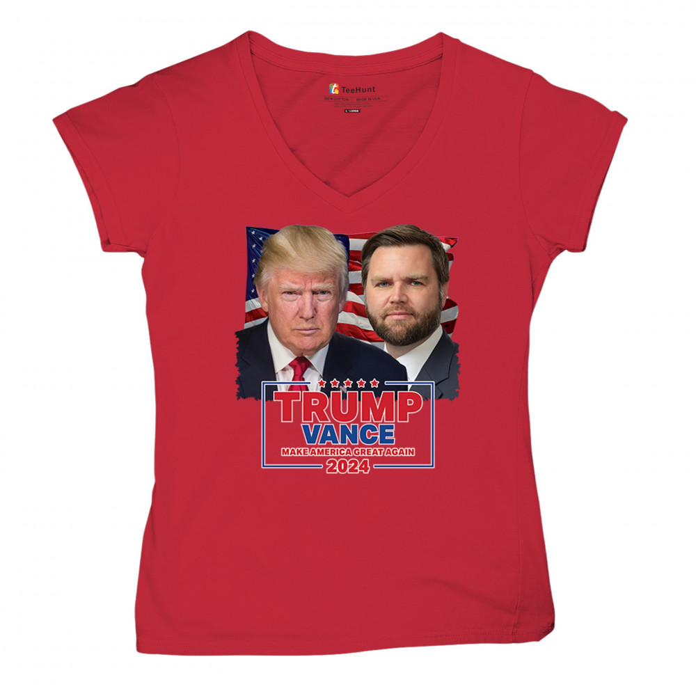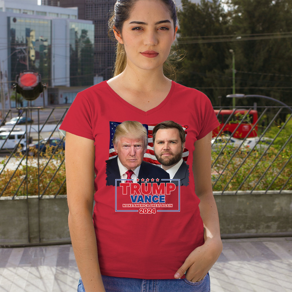 Show your support for Trump-Vance 2024 with this bold design featuring Trump and Vance against the American flag. Perfect for rallies and political events.
