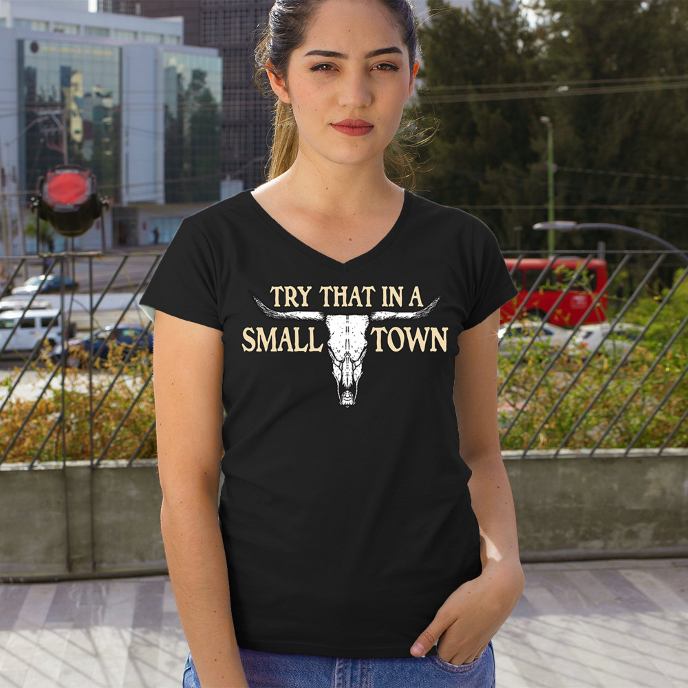 This design boldly proclaims "Try That in a SMALL TOWN," set against the backdrop of a stark cattle skull—a symbol deeply rooted in southern heritage and the undying American spirit. It's a tribute to the small-town sheriffs, the unwritten laws of backbone and duty, and the patriotic fervor that runs through the country's veins. Whether you're a motorcycle enthusiast, a Republican, or simply a connoisseur of all things vintage, this piece is a testament to enduring strength and local pride.