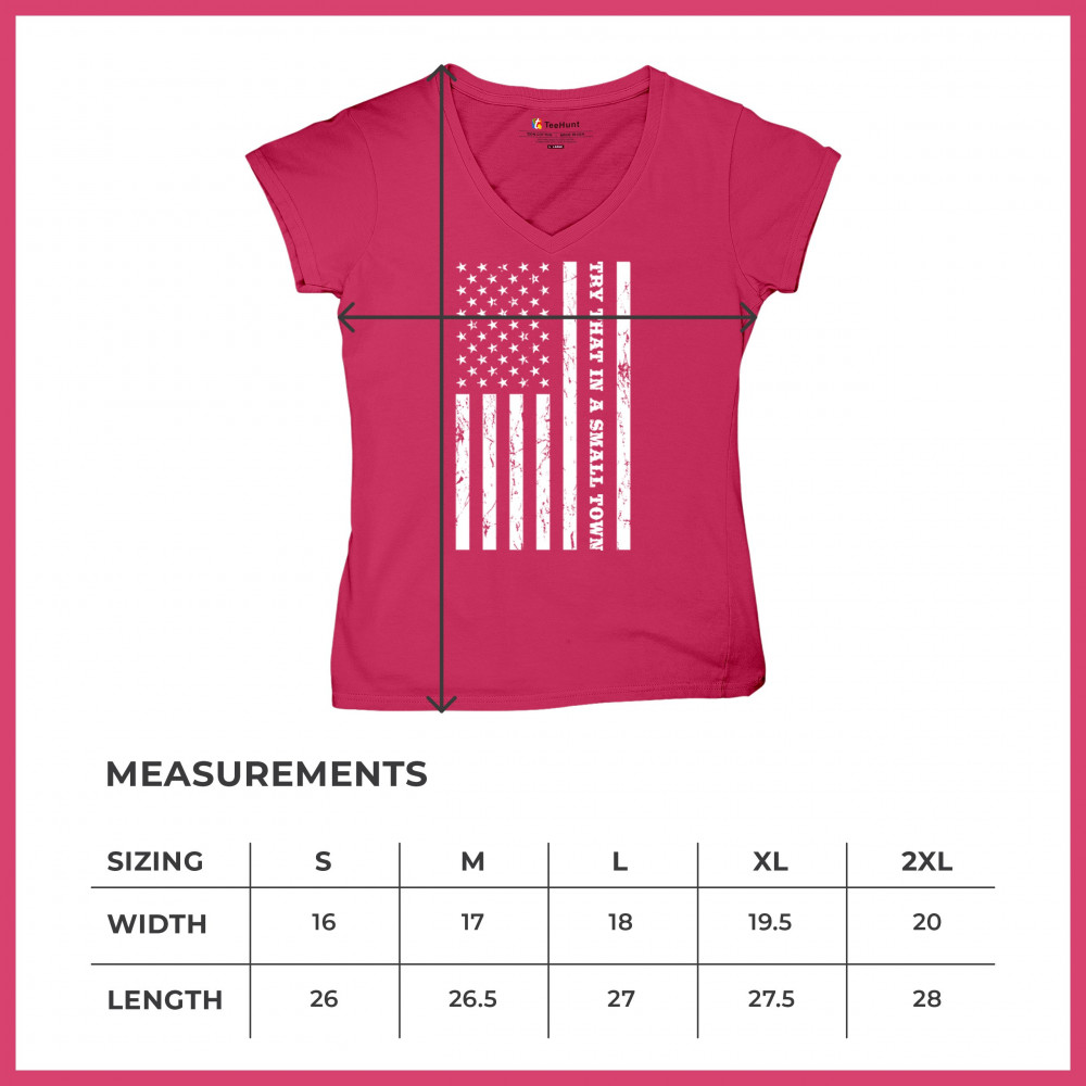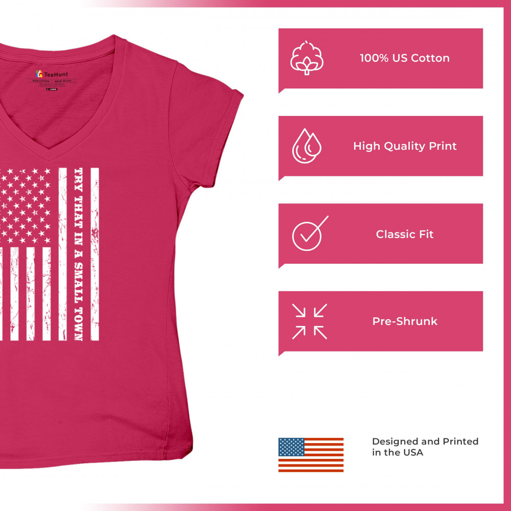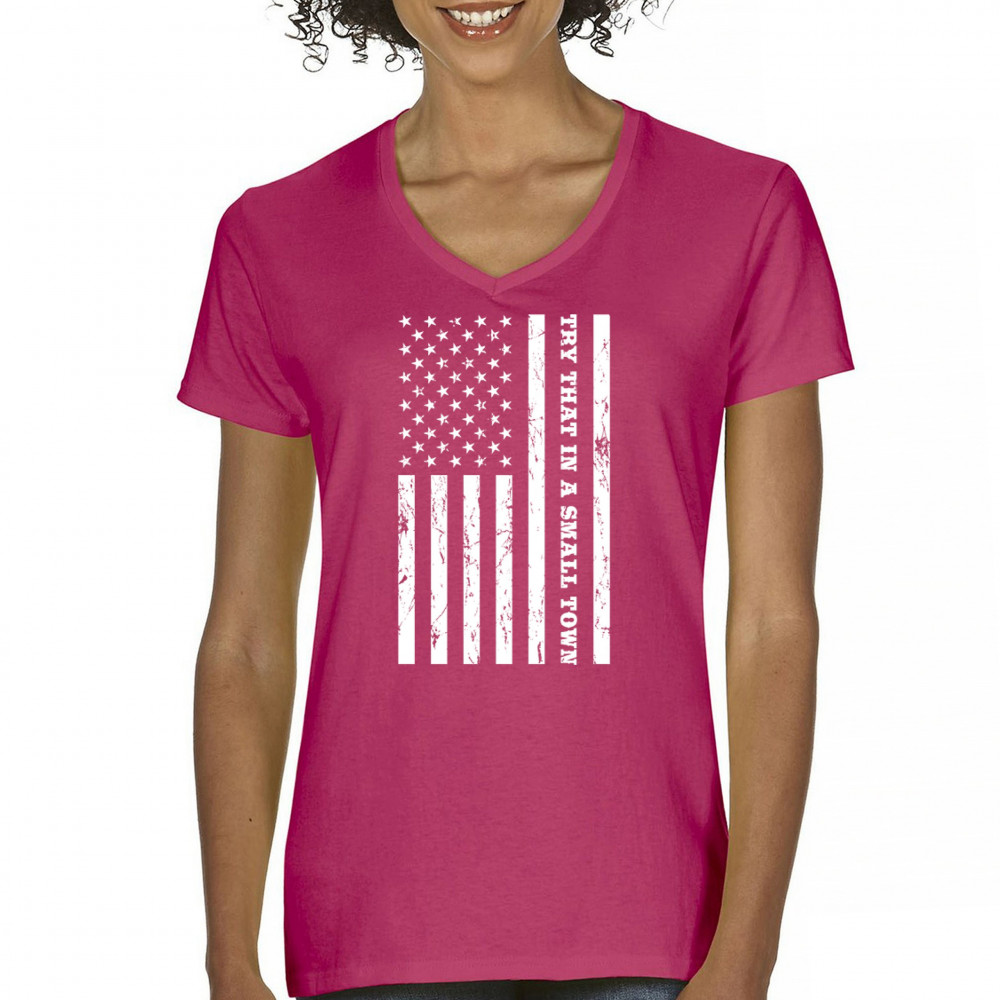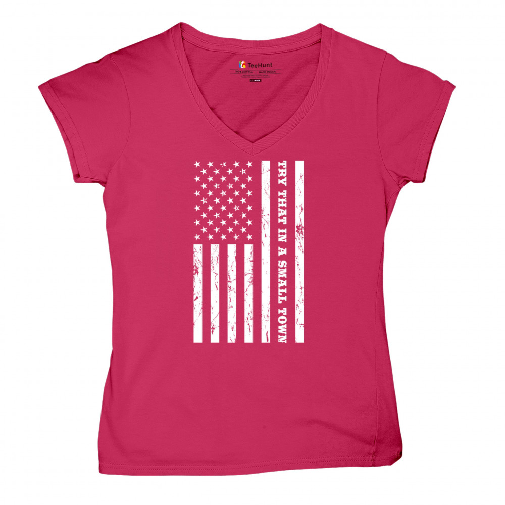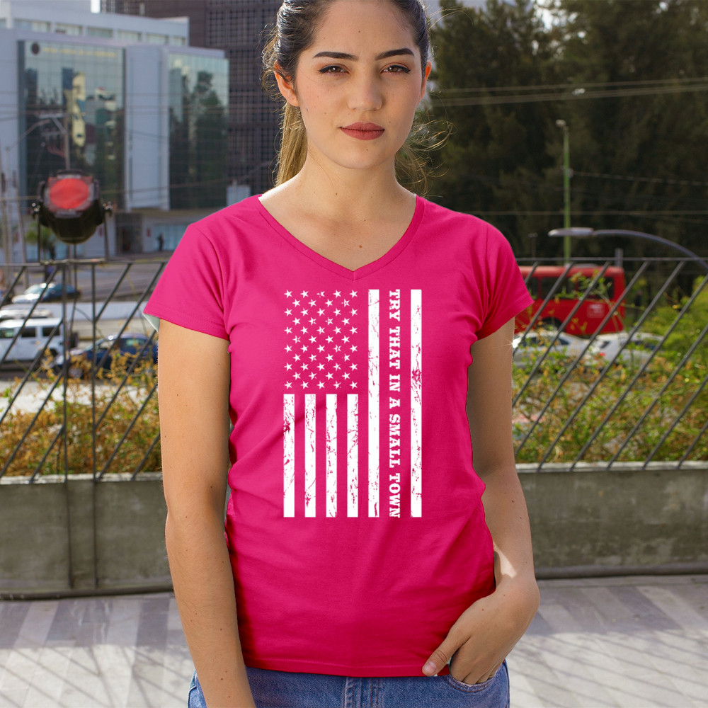 TRY THAT IN A SMALL TOWN GRUNGE AMERICAN FLAG women's v-neck t-shirt patriotic tee pink