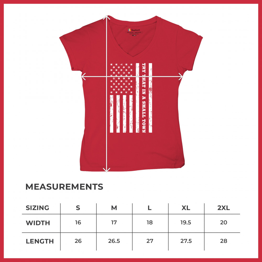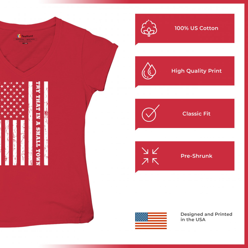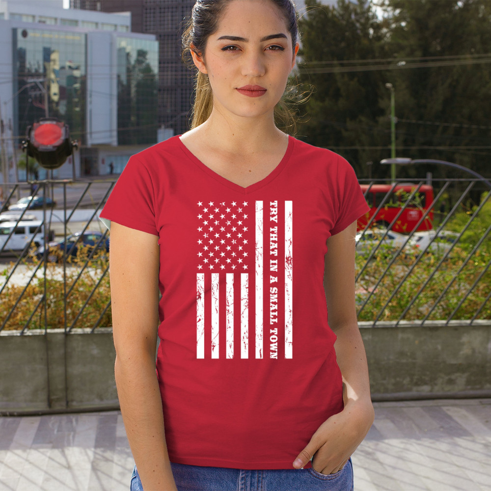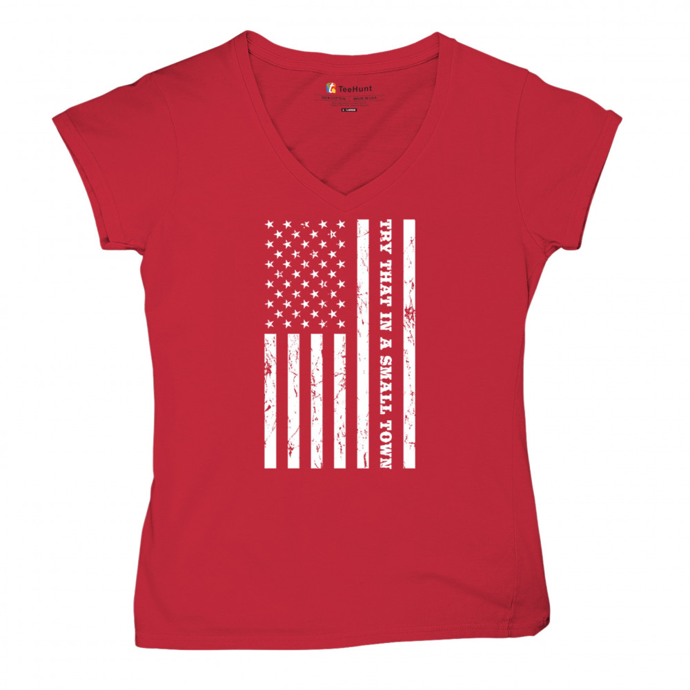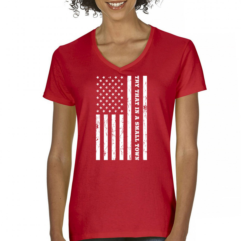 TRY THAT IN A SMALL TOWN GRUNGE AMERICAN FLAG women's v-neck t-shirt patriotic tee red