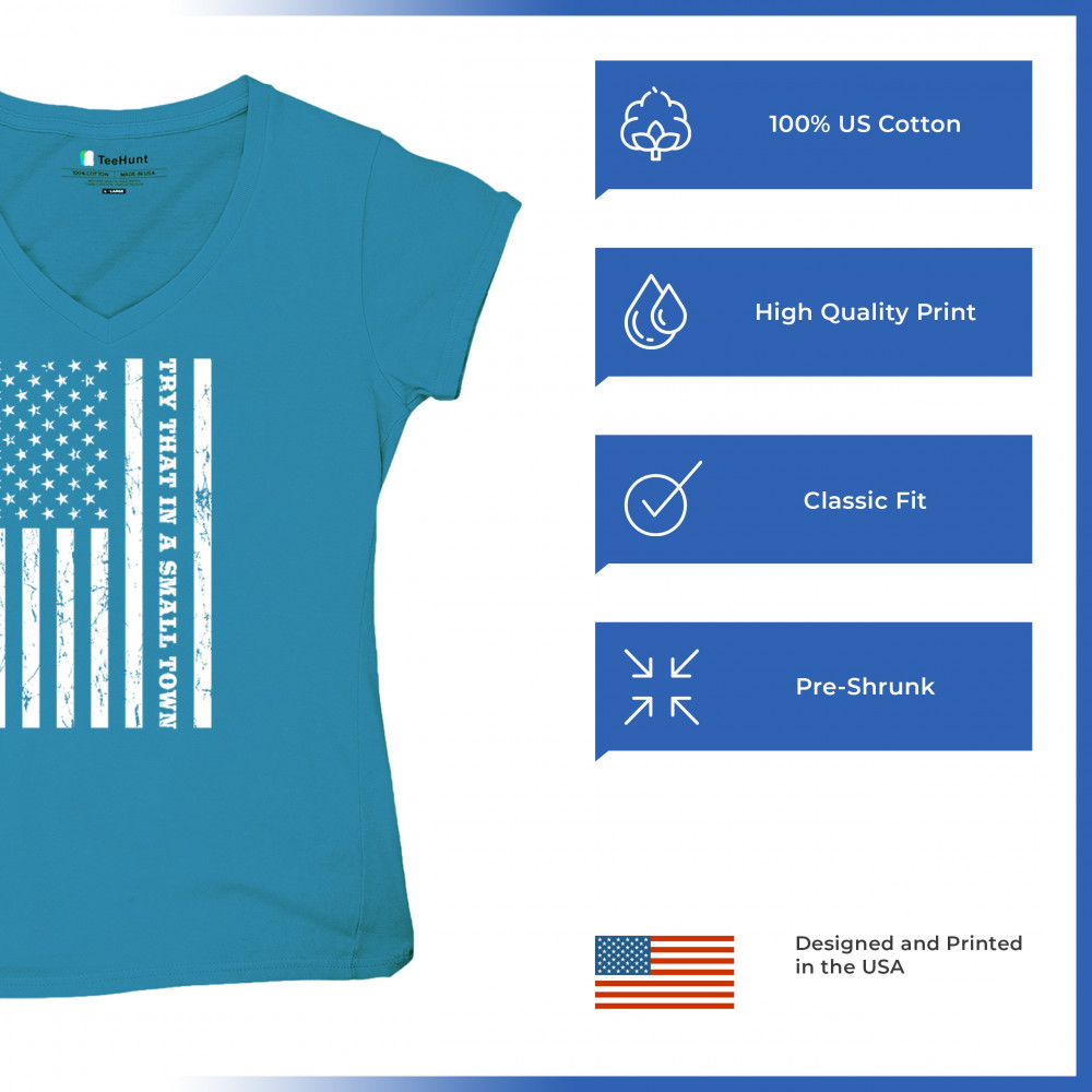 TRY THAT IN A SMALL TOWN GRUNGE AMERICAN FLAG women's v-neck t-shirt patriotic tee turquoise