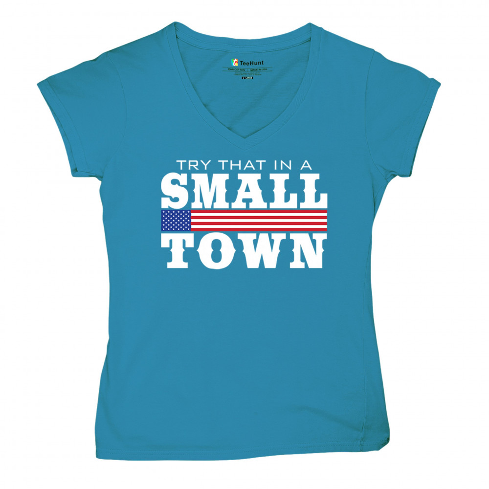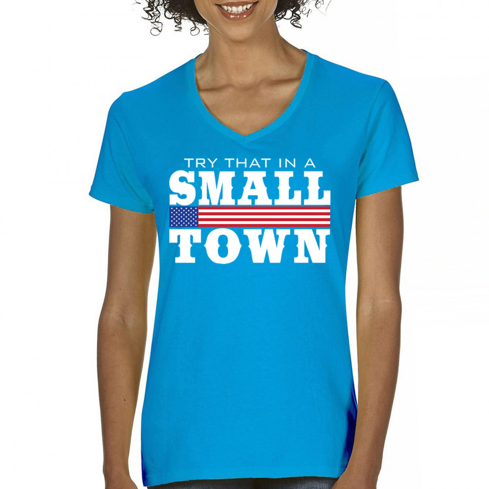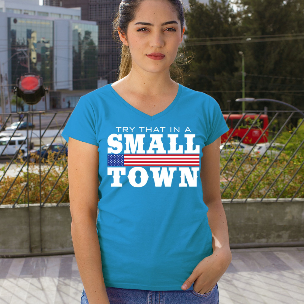 Celebrate small-town pride with our "Try That In A Small Town" design. Perfect for patriotic events, it features a bold American flag graphic.