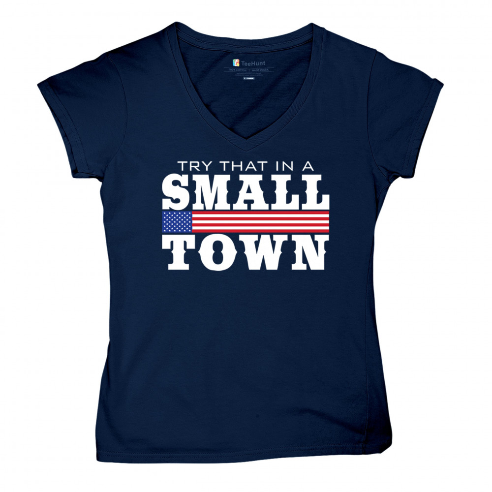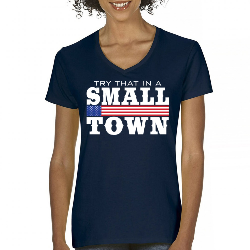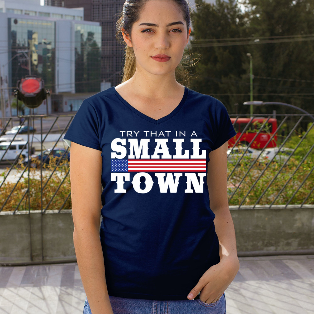 Celebrate small-town pride with our "Try That In A Small Town" design. Perfect for patriotic events, it features a bold American flag graphic.