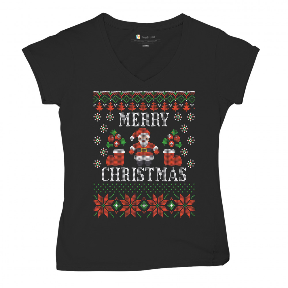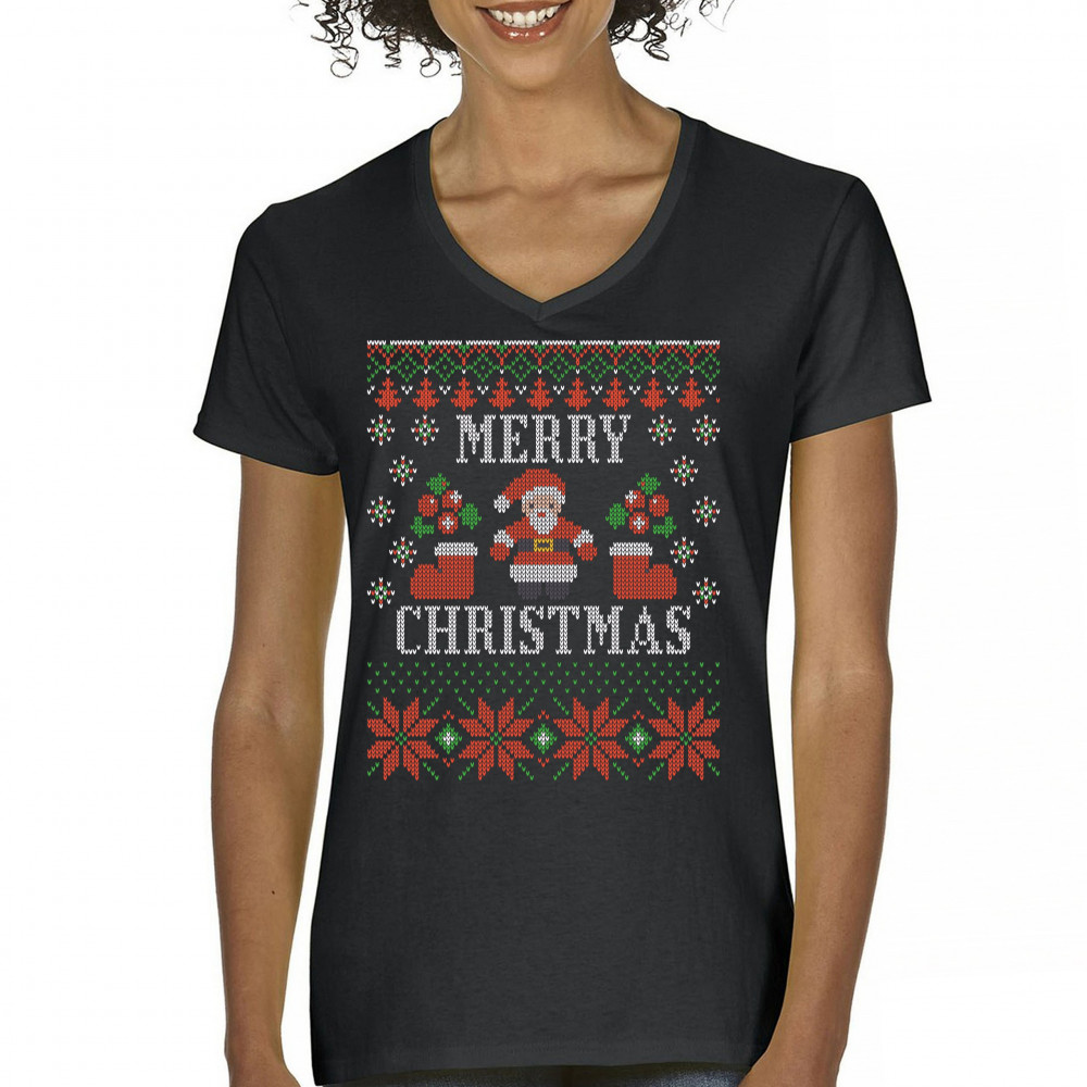 UGLY SWEATER SANTA CLAUS women's v-neck t-shirt let it snow christmas xmas tee black