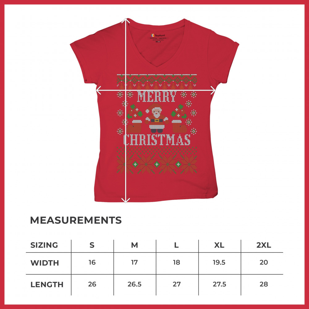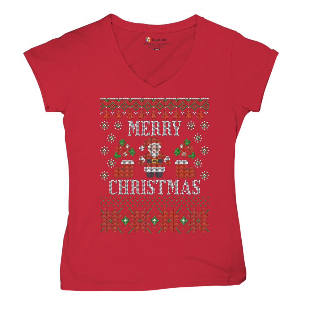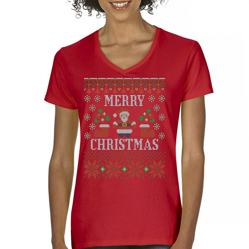 UGLY SWEATER SANTA CLAUS women's v-neck t-shirt let it snow christmas xmas tee red