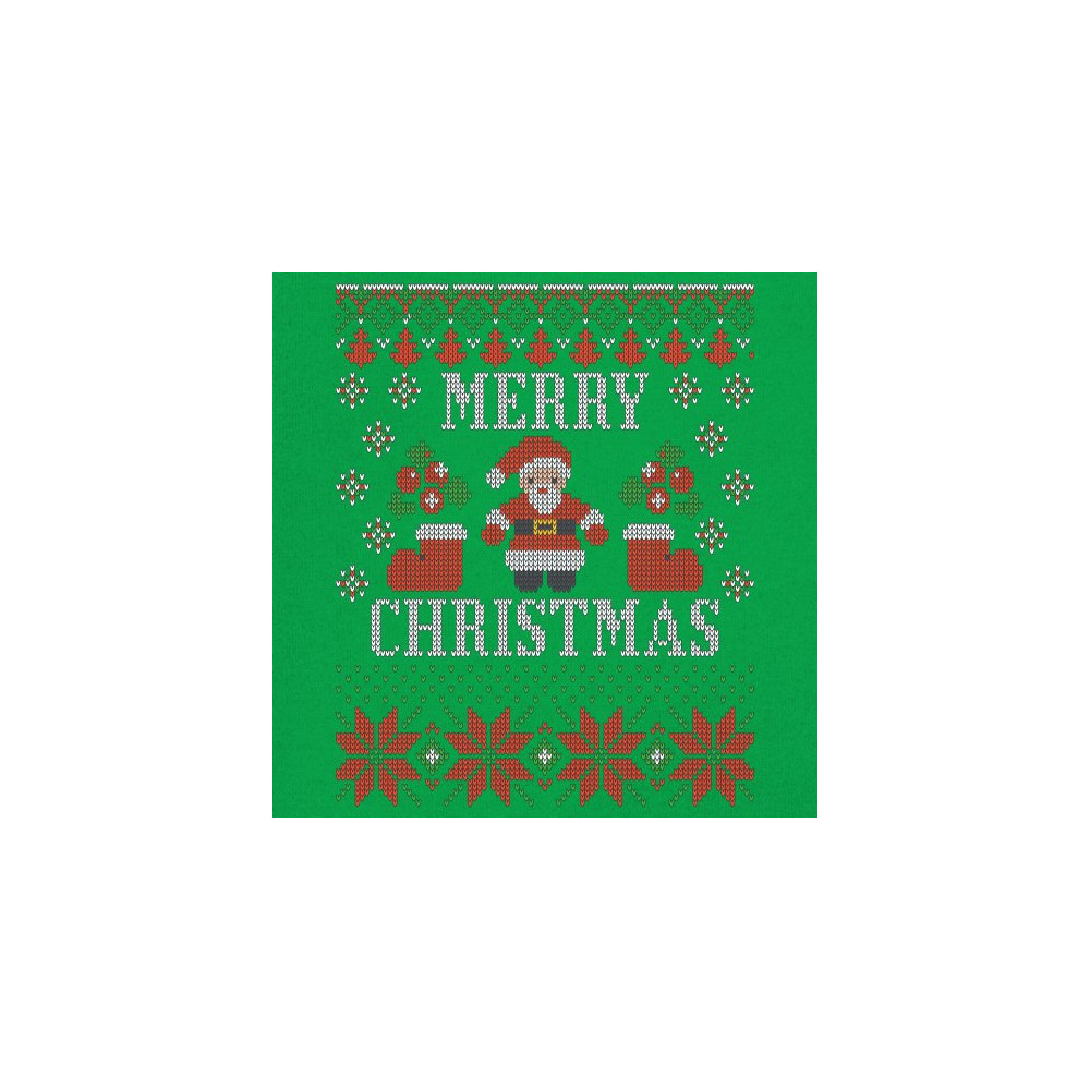 A print saying: "Merry Christmas" and depicting Santa Claus, two Christmas socks, multiple snowflakes and Christmas trees. The print is decorated as an ugly sweater. A great choice for a Christmas eve celebration.