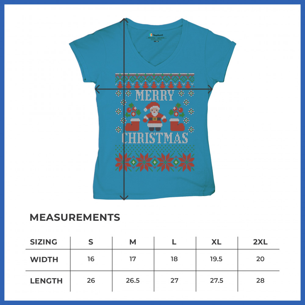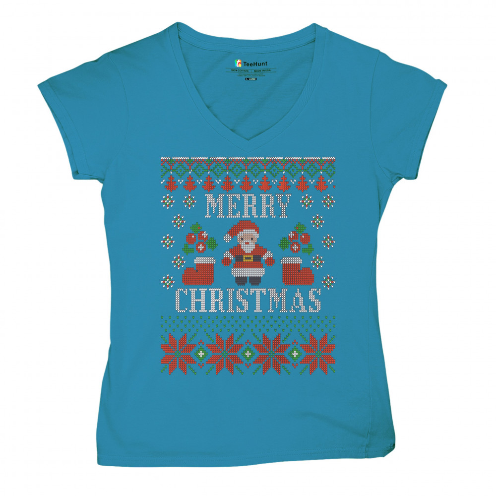 UGLY SWEATER SANTA CLAUS women's v-neck t-shirt let it snow christmas xmas tee turquoise