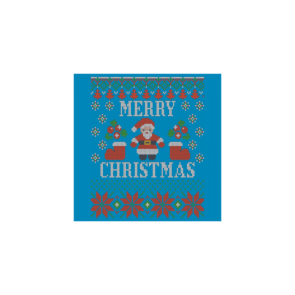A print saying: "Merry Christmas" and depicting Santa Claus, two Christmas socks, multiple snowflakes and Christmas trees. The print is decorated as an ugly sweater. A great choice for a Christmas eve celebration.
