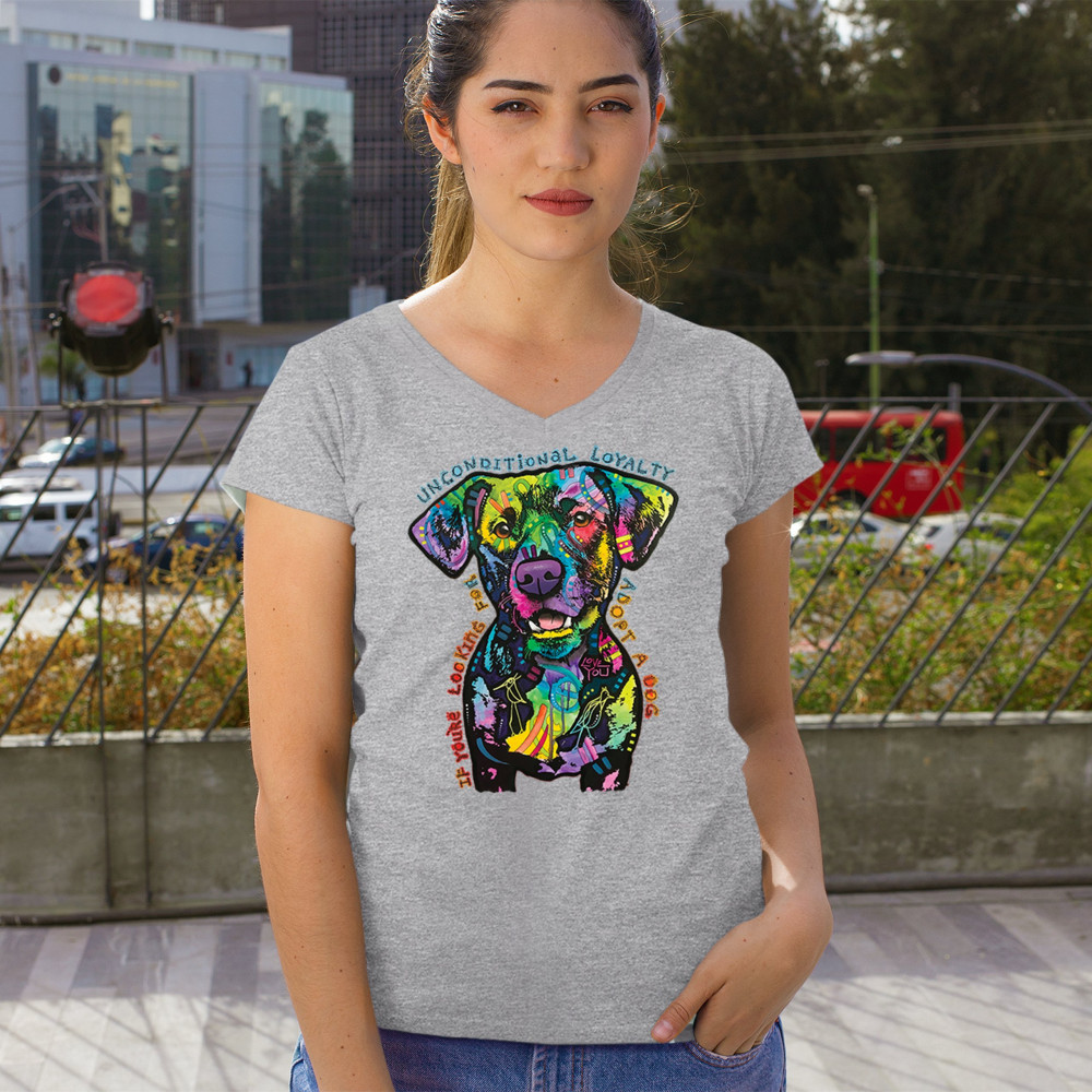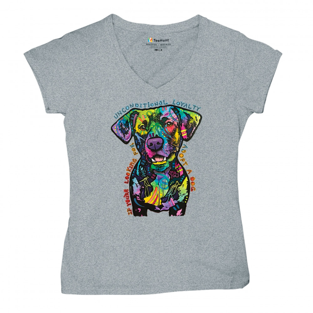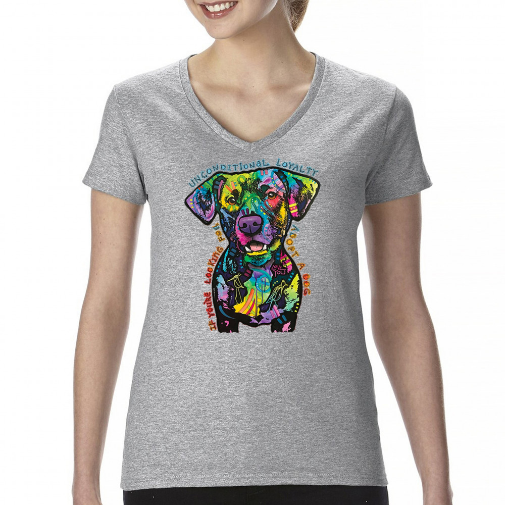 UNCONDITIONAL LOYALTY women's v-neck t-shirt adopt a dog dean russo pets tee gray
