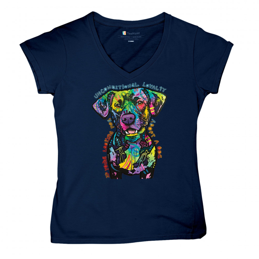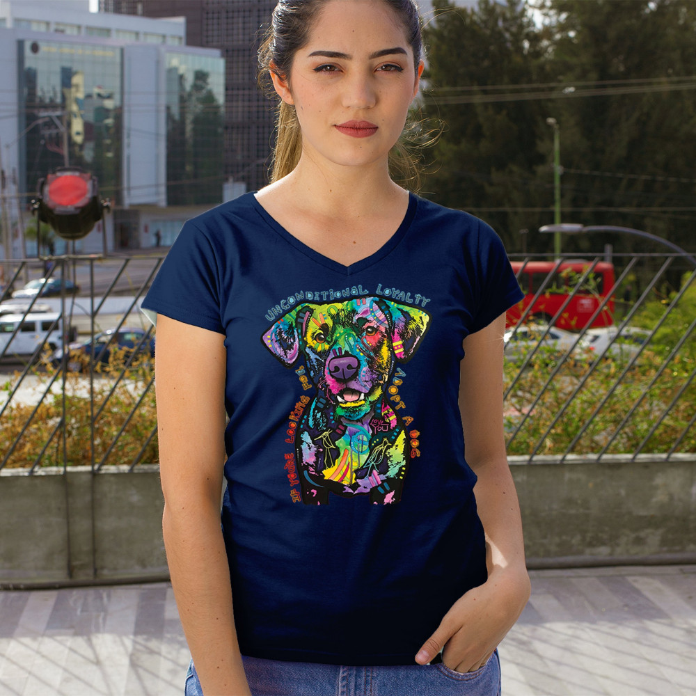 UNCONDITIONAL LOYALTY women's v-neck t-shirt adopt a dog dean russo pets tee navy blue