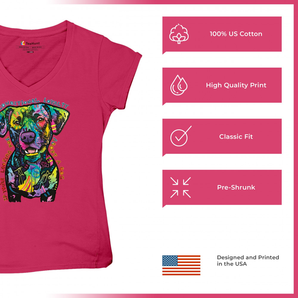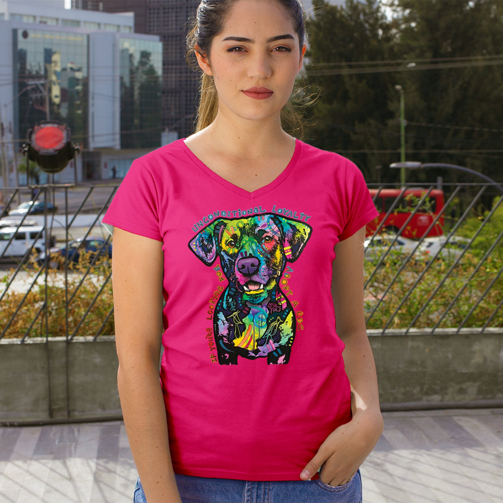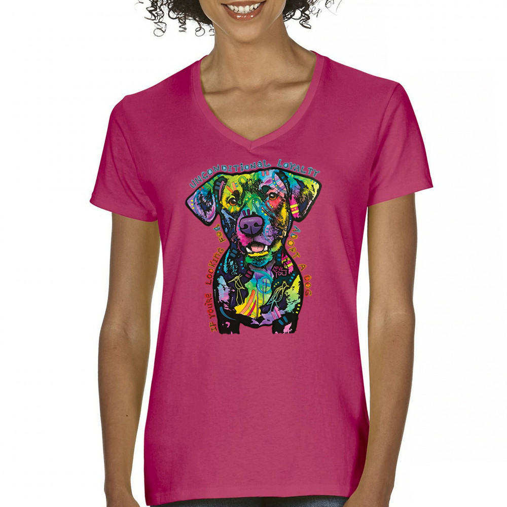 UNCONDITIONAL LOYALTY women's v-neck t-shirt adopt a dog dean russo pets tee pink