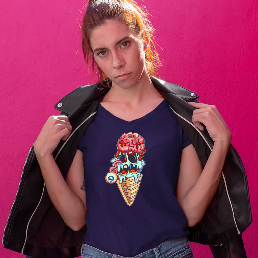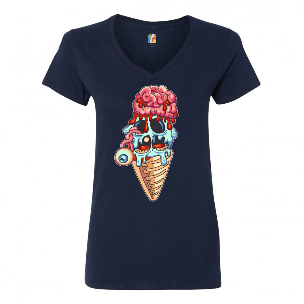 UNDEAD ZOMBIE ICE CREAM women's v-neck t-shirt happy halloween eat brains tee navy blue