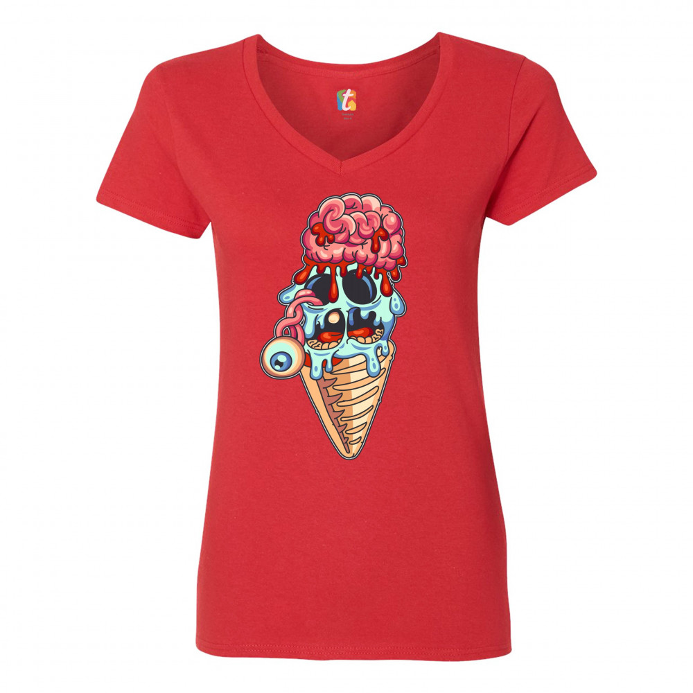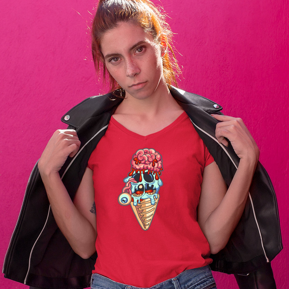 A print featuring an undead ice cream. The ice cream ball looks like a head of a zombie with an eye popping out and hanging and bloodied brains attached on top. A great choice for a person who is into horror movies, haunted houses and freaking people out!
