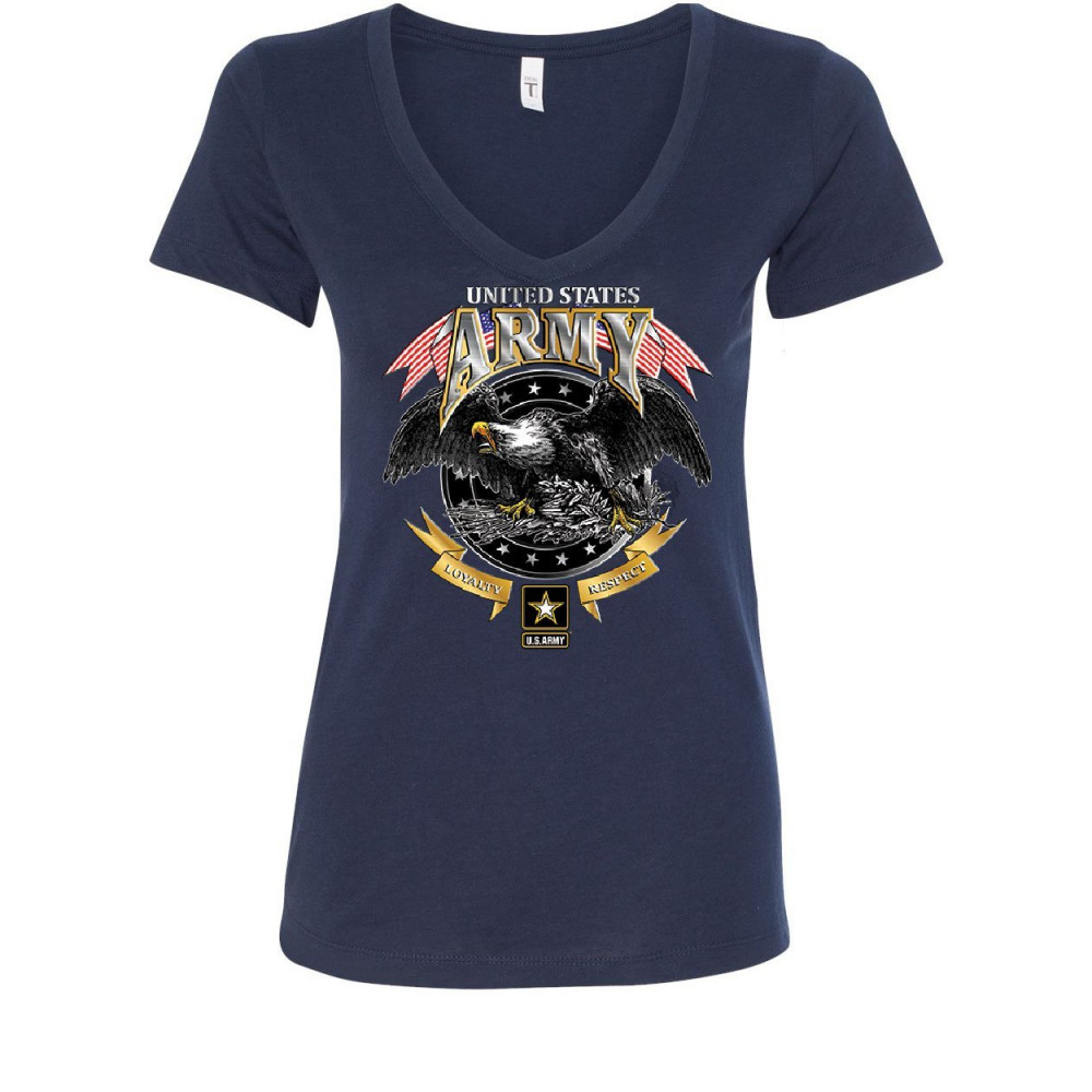 UNITED STATES ARMY women's v-neck t-shirt loyalty respect bald eagle pow mia navy blue