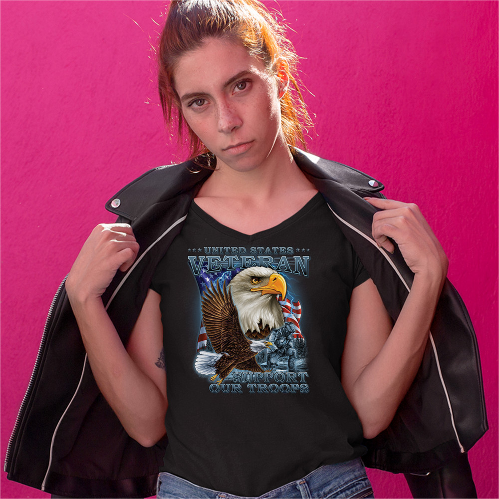 A patriotic print featuring a flying American bald eagle. There is another bald eagle covering most of the American flag in the background. There is a kneeling soldier in the front. The print says: "United States Veteran, Support our Troops". A great choice for a true patriot of the USA