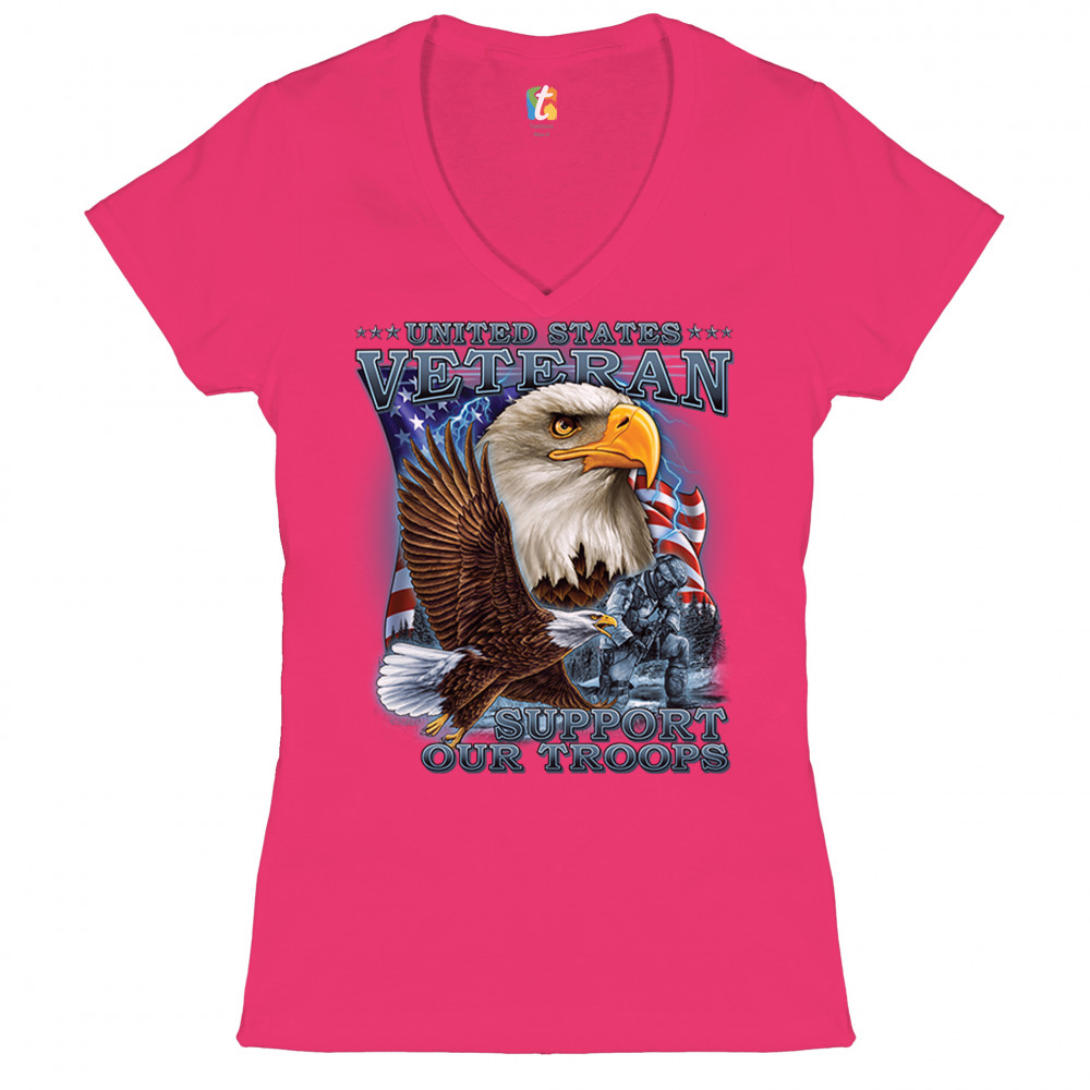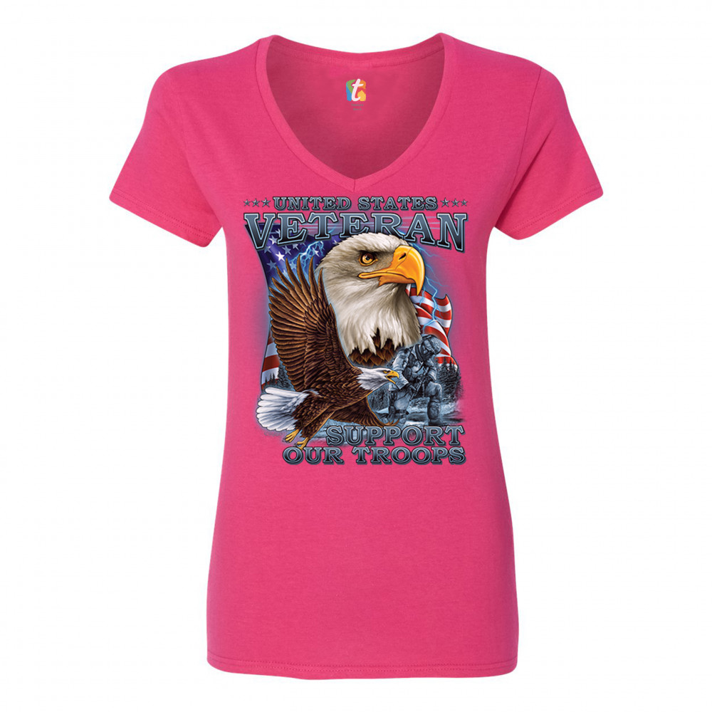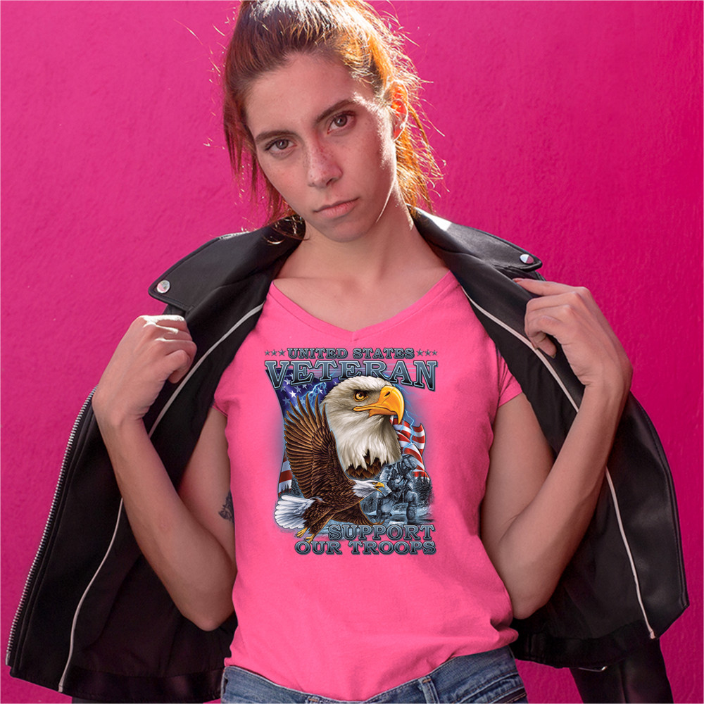 A patriotic print featuring a flying American bald eagle. There is another bald eagle covering most of the American flag in the background. There is a kneeling soldier in the front. The print says: "United States Veteran, Support our Troops". A great choice for a true patriot of the USA