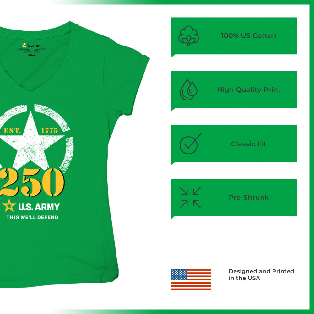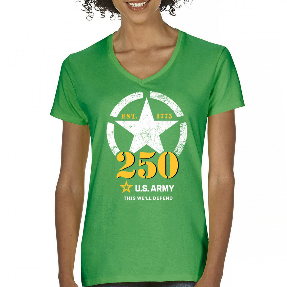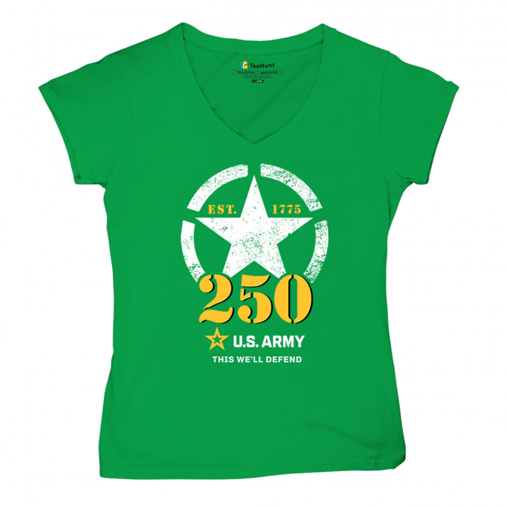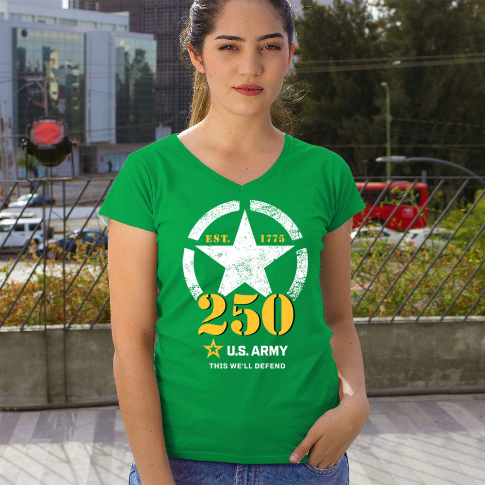 Celebrate 250 years of U.S. Army duty and pride with bold stencil design, EST 1775 mark, and patriotic “This We’ll Defend†motto.