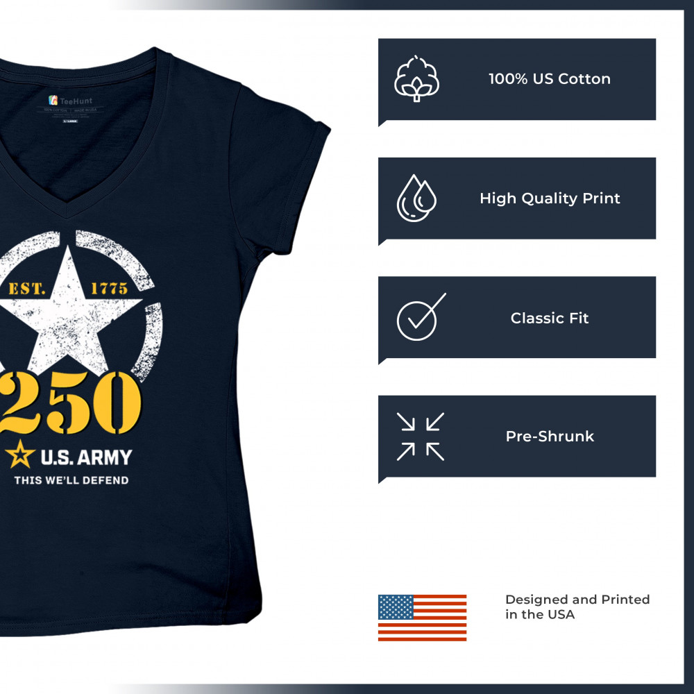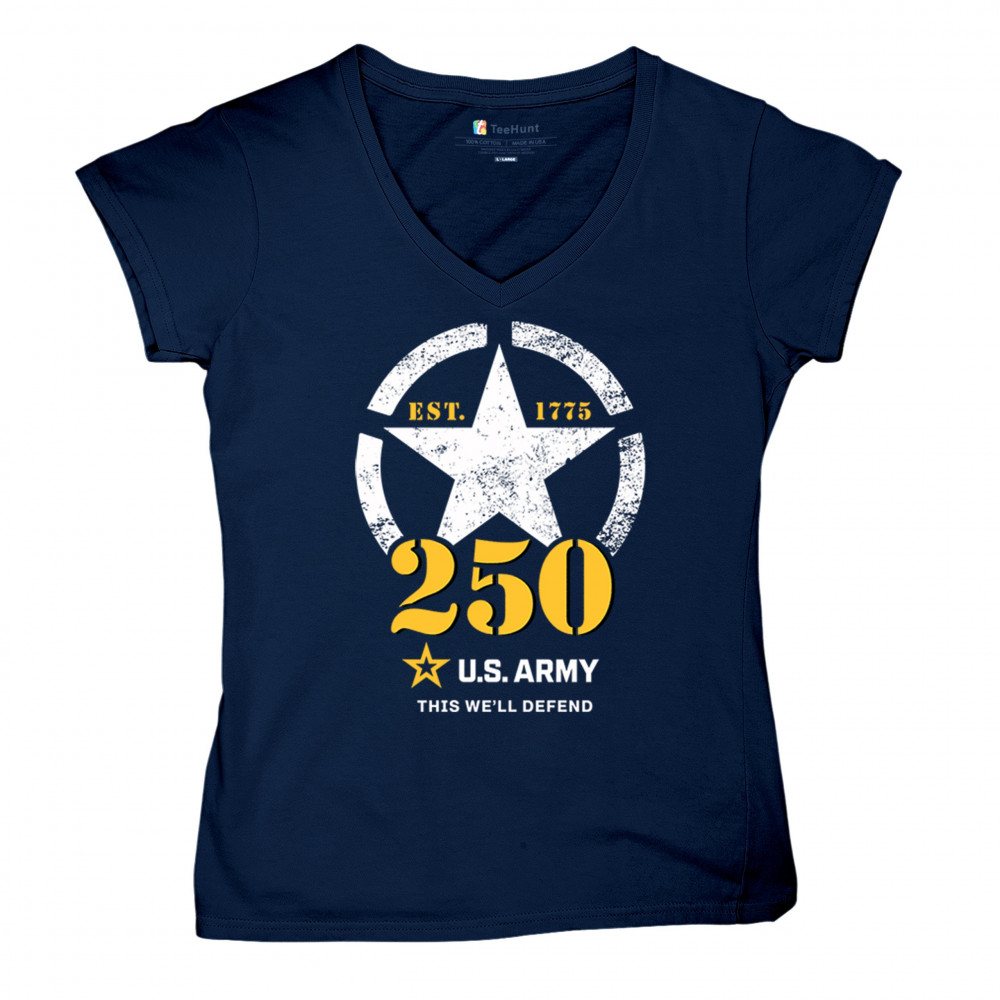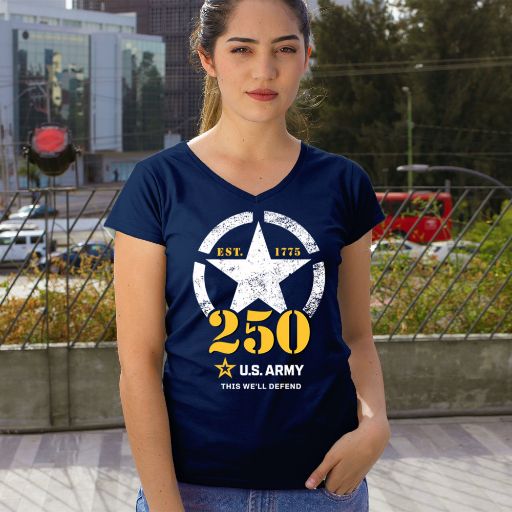 Celebrate 250 years of U.S. Army duty and pride with bold stencil design, EST 1775 mark, and patriotic “This We’ll Defend†motto.