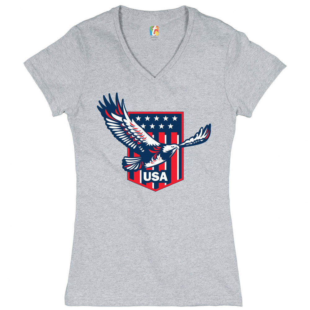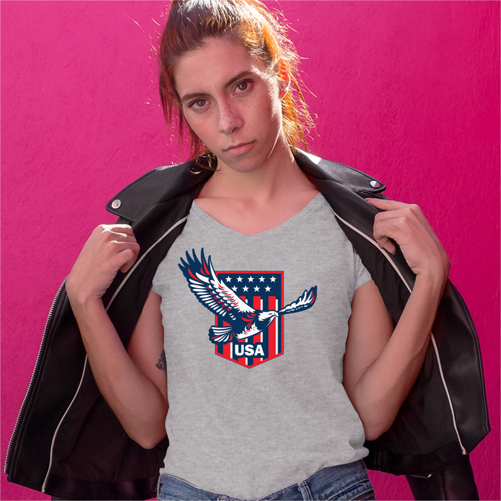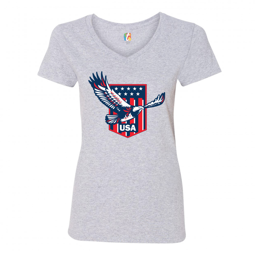 USA BALD EAGLE women's v-neck t-shirt stars and stripes shield 4th of july tee gray