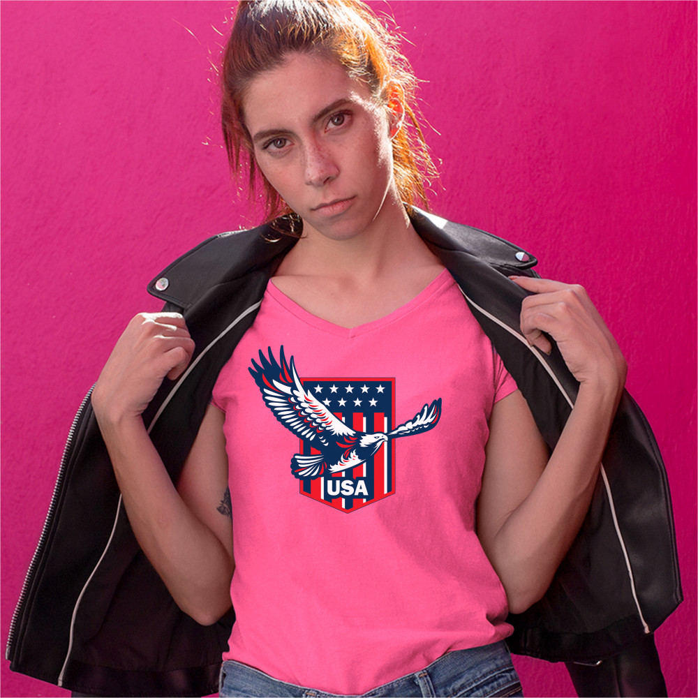 USA BALD EAGLE women's v-neck t-shirt stars and stripes shield 4th of july tee pink