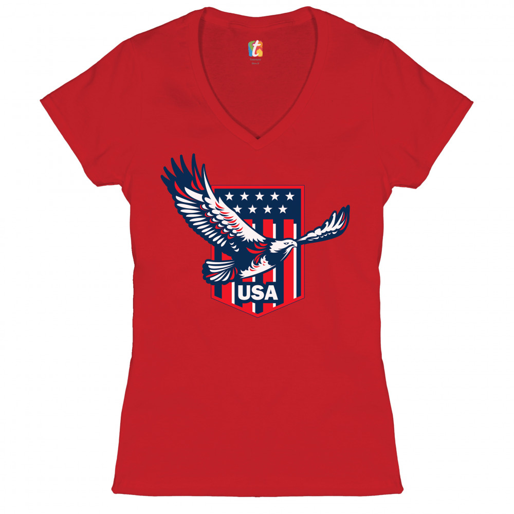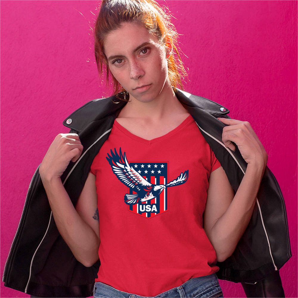 USA BALD EAGLE women's v-neck t-shirt stars and stripes shield 4th of july tee red