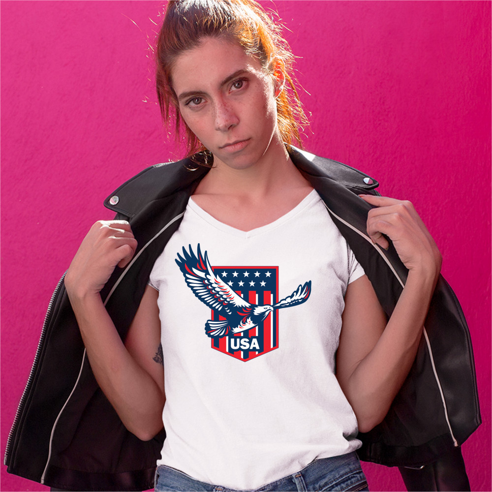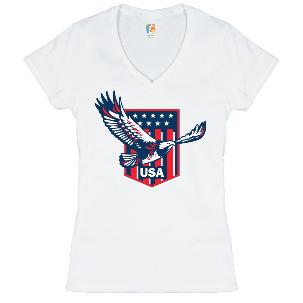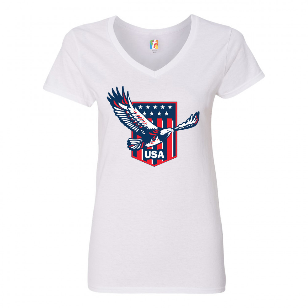 USA BALD EAGLE women's v-neck t-shirt stars and stripes shield 4th of july tee white